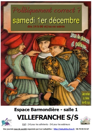 Le samedi 1er décembre, de 14 heures à très tard dans la nuit, les hostilités se dérouleront à l’Espace Barmondière de Villefranche sur Saône (69). Repas chaud et ambiance conviviale possible le soir pour 3 euros / personne.
