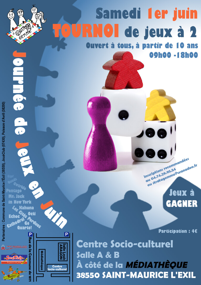 Cette journée se passera dans la salle du centre socioculturel de Saint-Maurice l’Exil le samedi 1er juin de 10h00 à 17h30. L’accueil commence à 09h00, pour permettre les inscriptions et la découverte des jeux. La remise des lots se fera à 18h00.