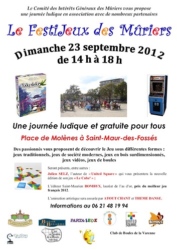 Bonjour à tous, ce dimanche aura lieu de 14h à 18h la deuxième édition du festi-jeux des muriers sur la place des Molènes à Saint Maur dans le Val de Marne (94).