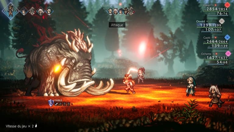 Vaincre le boss de ce chapitre, ou plutôt les bosses de ce chapitre, car ils sont deux, ce n’est pas une mince affaire. Pour mon plus grand déplaisir, ces deux adversaires verrouillent leurs vulnérabilités magiques dès le début du combat, et ce n’est qu’une fois l’un des deux vaincus qu’Ophilia sera capable d’affronter efficacement le second. Il me faut une stratégie.
