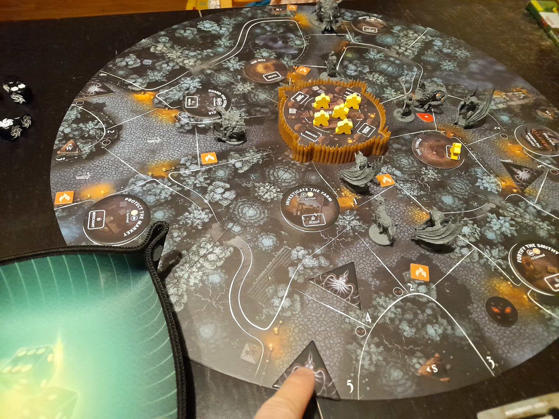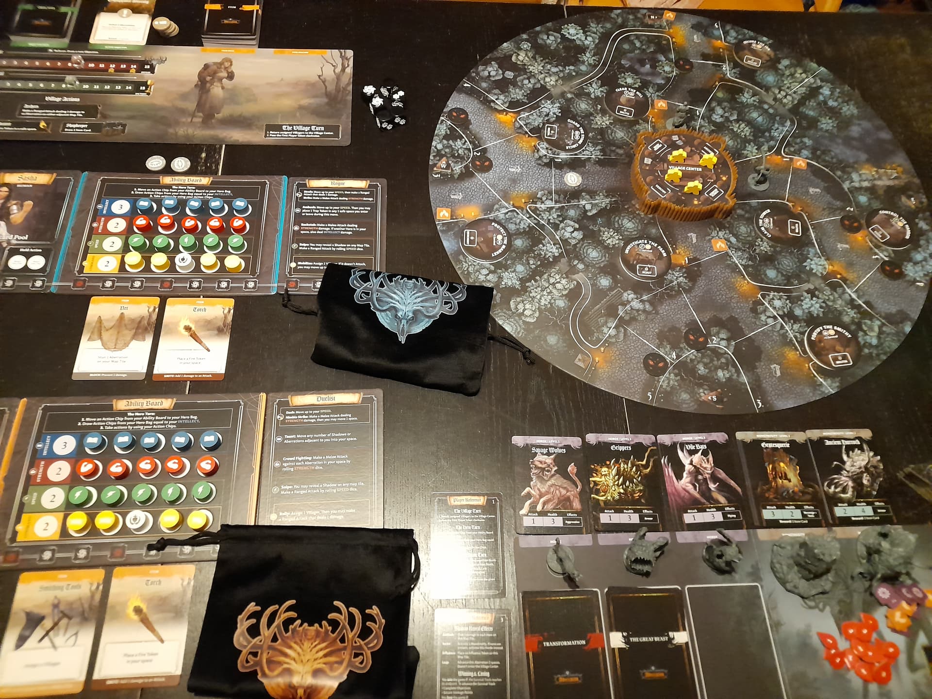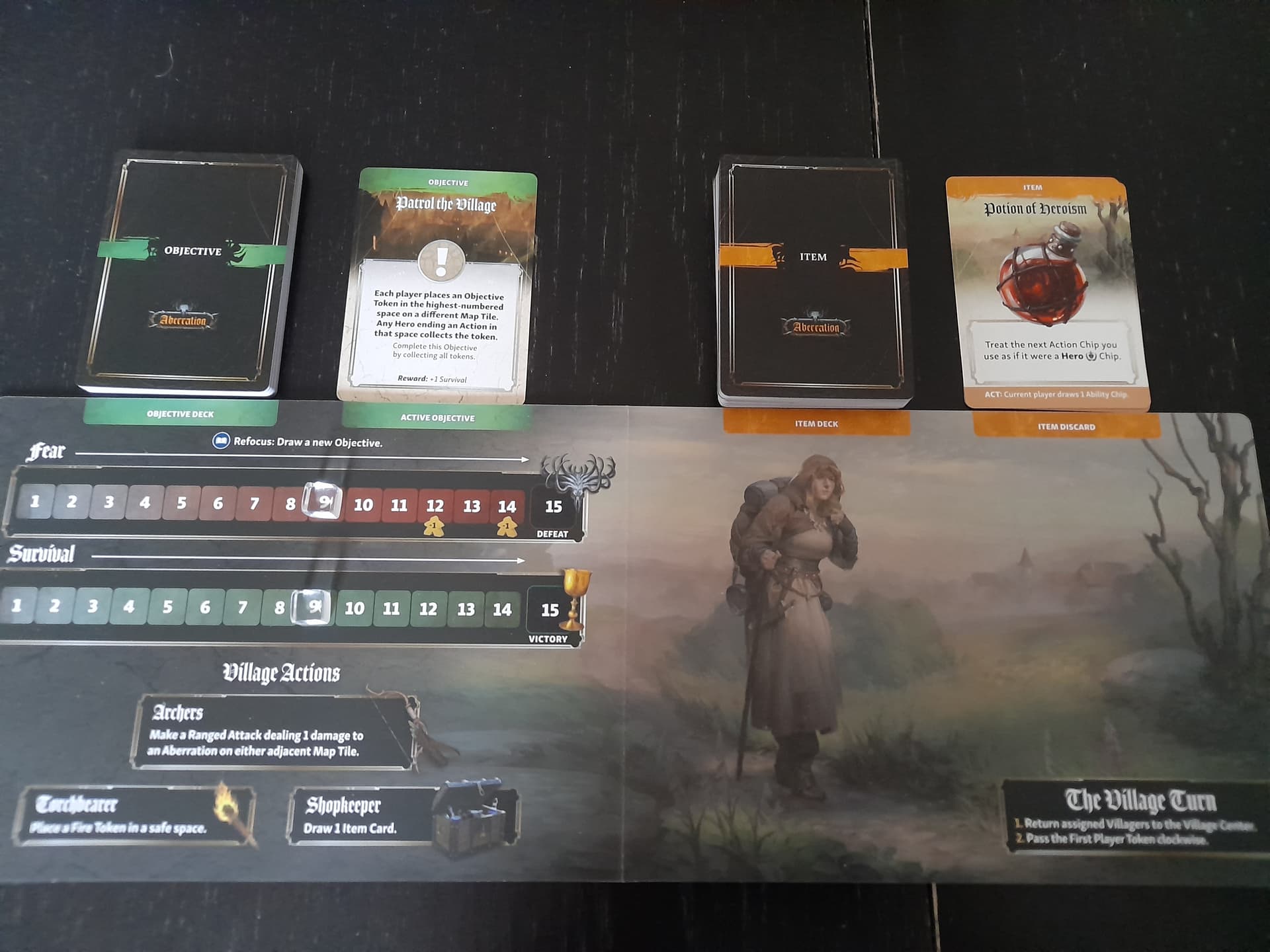 Ce plateau sert de rappel à la phase village, il permet aussi de suivre les points de victoire et le niveau de peur. Au-dessus on y trouve l’objectif en cours et le deck objets.