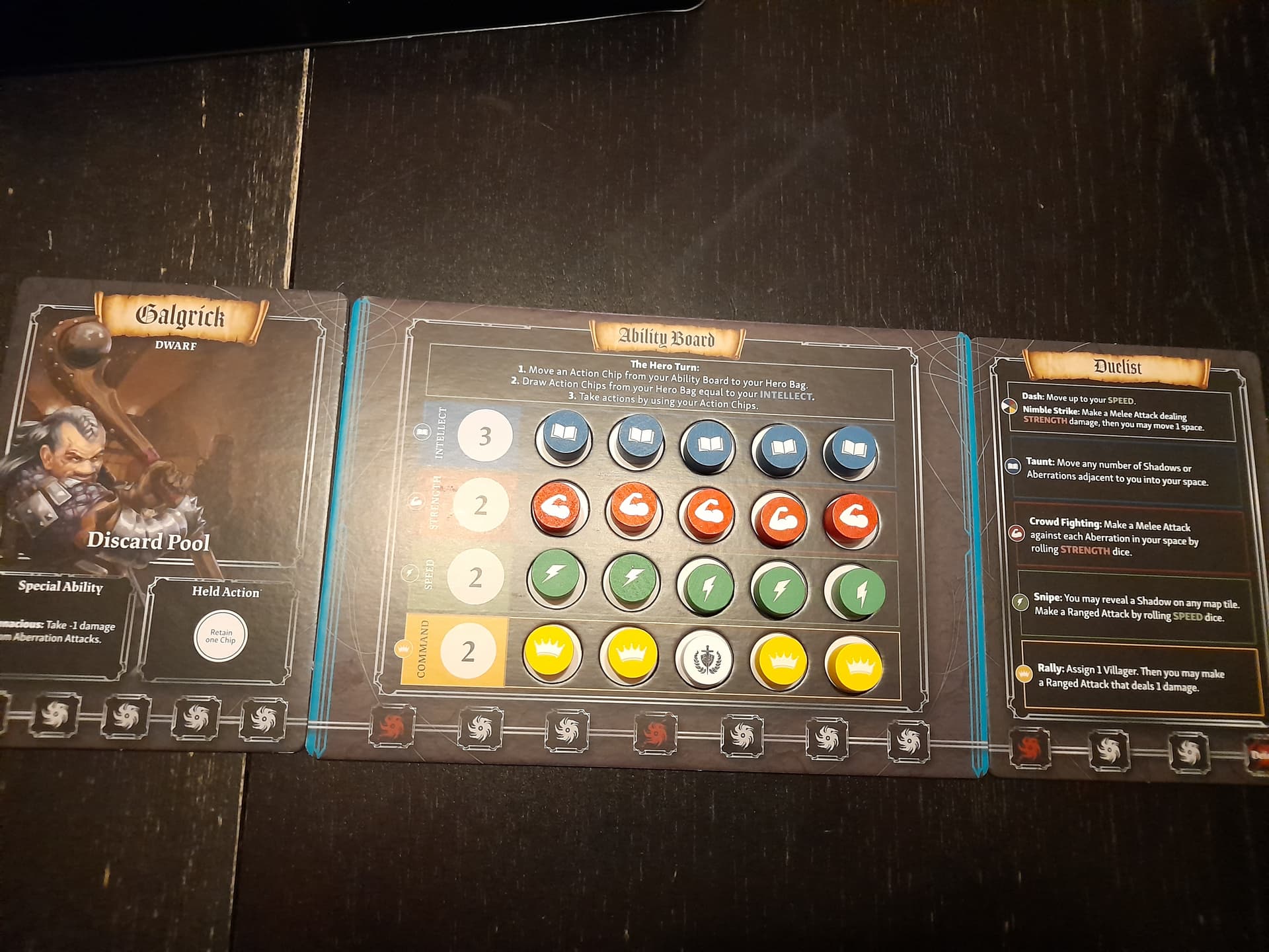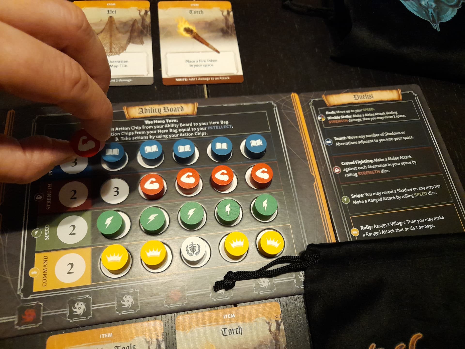- Avec le jeton rouge je vais pouvoir réaliser 1 actions parmi 3. Les 2 actions génériques (tout en haut du plateau classe) ou l’action rouge “force” qui dans le cas du duelliste va me permettre de taper tous les ennemis sur le même emplacement que moi en jetant autant de dés que ma force “3”.