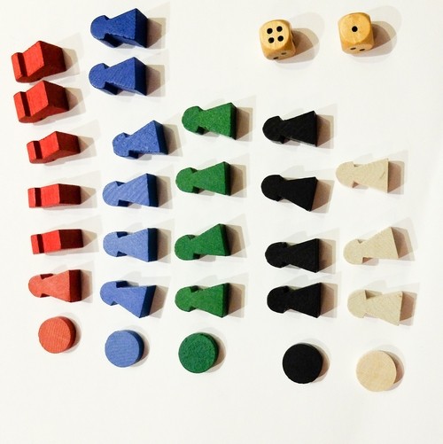 En rouge et bleu, 2 gros meeples, 4 petits, un pion rond