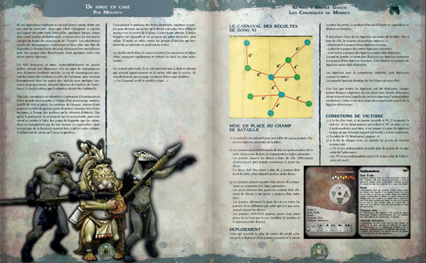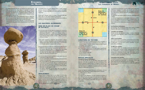L’autre aspect particulier des chroniques, c’est l’histoire dans laquelle sont plongés les joueurs. Alkemy possède un univers riche et dense depuis ces débuts, et les chroniques permettent de continuer la chronologie de Mornéa. Lors des précédentes chroniques, vous avez découvert les “Evadés du pénitencier de la dent”, leur incroyable invasion jusqu’au dénouement final influencé par le résultat des parties des joueurs ( http://issuu.com/alkemy/docs/chroniques-2012-2013 ), vous allez partir cette fois-ci à la découverte du “Temple” et du “Clan Walosi”, sous-faction du Royaume d’Avalon et de la Nation Aurlok.