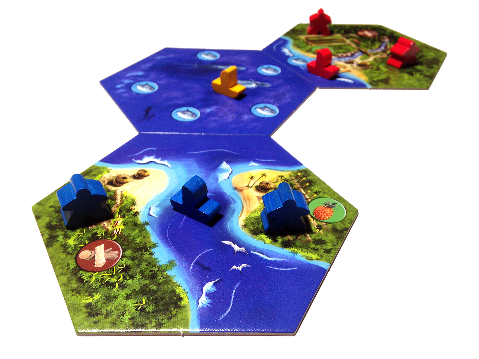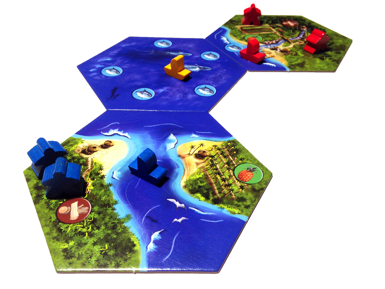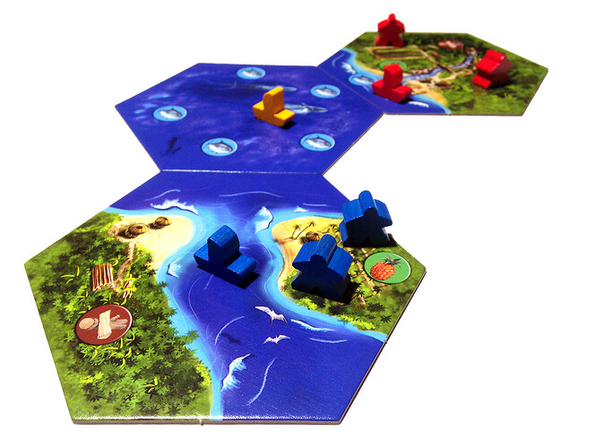 1) Il serait logique et réaliste qu’avec la disposition #1, le joueur Bleu soit obligé de mettre 1 cube de Bois sur le marché intérieur puisqu’il ne peut récolter qu’1 cube de Fruit exotique, ses 2 Meeples étant sur la rive où il y a l’icône Fruit exotique.