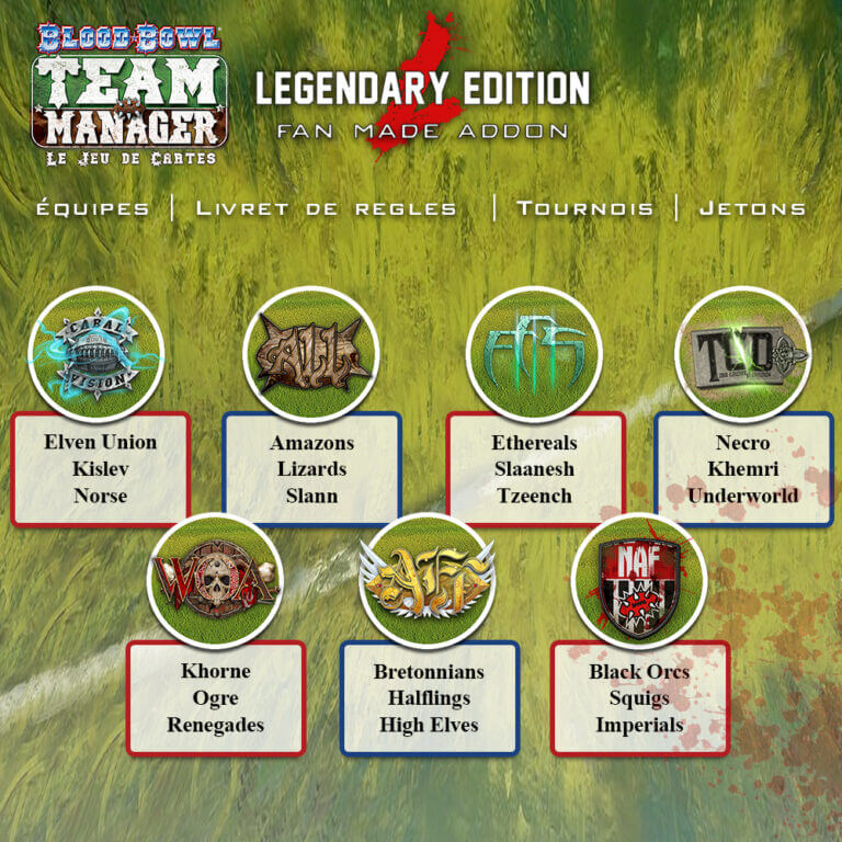 Il s’agit de nouvelles équipes et autres tout en français et de qualité professionnelle (vous trouverez des images facilement sur le web en recherchant blood bowl team manager legendary édition). Attention, il s’agit d’une extension qui nécessite le jeu de base (trouvable d’occasion sur les sites les + connus).