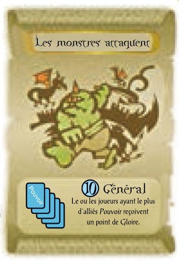 Le tour s’arrête à l’issue de la rencontre où au moins un joueur n’a plus de carte en main. Ceux à qui il en reste les ajouteront à leurs alliés. En fonction de la carte Récit jouée, les alliés des uns ou des autres feront gagner un jeton Gloire en écrivant les hauts faits, les Chroniques de l’Histoire. Le premier qui arrive à 3 points de Gloire remporte la partie.