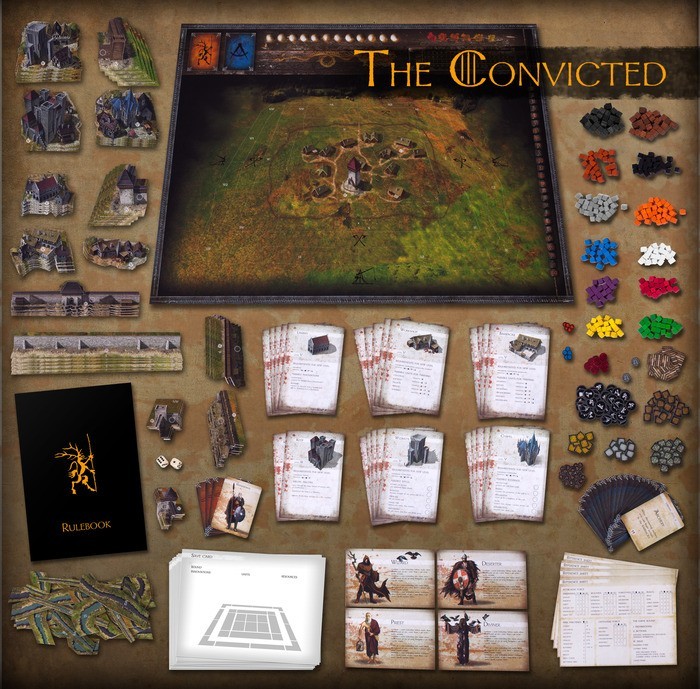 The Convicted, donc, est un jeu coopératif d’une équipe polonaise, Mateusz Albricht (l’auteur principal), Marek Sanecki et Paweł Puchniewicz pour 1 à 4 joueurs (jusqu’à 5 en réalité, avec la possibilité pour le 5e de contrôler les envahisseurs) dans lequel les joueurs incarnent des prisonniers condamnés à de lourdes peines, et à qui le Roi propose de les gracier s’ils partent coloniser une région nouvellement découverte en son nom. Bien évidemment, cette nouvelle contrée était déjà habitée, on bâtit donc notre cité en territoire hostile, tout en résistant aux hordes indigènes qui l’assiègent.