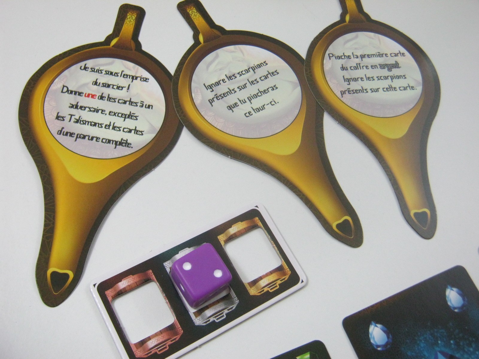 Le but est simple avoir le plus de points en fin de partie. Pour cela vous allez devoir récupérer des bijoux et des pierres précieuses. Une fois la mise en place faite, les paquets de cartes mélangés, les plaquettes de programmation et les dés donnés aux joueurs la partie peut débuter. Chaque tour se déroule en 3 phases : choisir un coffre, invoquer le génie et fouiller les coffres. Chaque joueur va donc secrètement choisir la valeur de son dé et le placer dans l’un des 3 emplacements qui représentent les 3 styles de coffre (doré, argenté et cuivré). L’emplacement désigne le type de coffre et le dé le nombre de cartes qui pourra être pioché. On révèle ensuite son choix tous en même temps, si deux dés sont identiques les joueurs doivent poser le plus vite possible leur main sur la lampe. Le joueur le plus rapide frotte la lampe et pioche jusqu’à 3 cartes pour réaliser un des pouvoirs. On passe à la fouille pour chaque coffre, le joueur l’ayant choisi ou ayant le plus petit dé s’ils sont plusieurs, peut piocher. Il pourra piocher autant de cartes que le chiffre qu’il a choisi sur son dé, mais il pourra aussi décider de s’arrêter en cours de route s’il le souhaite. Car certaines cartes possèdent des scorpions, et leur nombre doit être strictement inférieur au chiffre du dé pour que le joueur puisse conserver ses cartes précédemment piochées. On continue ainsi jusqu’à qu’un sorcier soit tiré, puis chaque joueur compte ses combinaisons qui possèdent des valeurs variables et celui qui a le plus de points remporte la partie. Une variante avec un jeton anneau est également proposée.