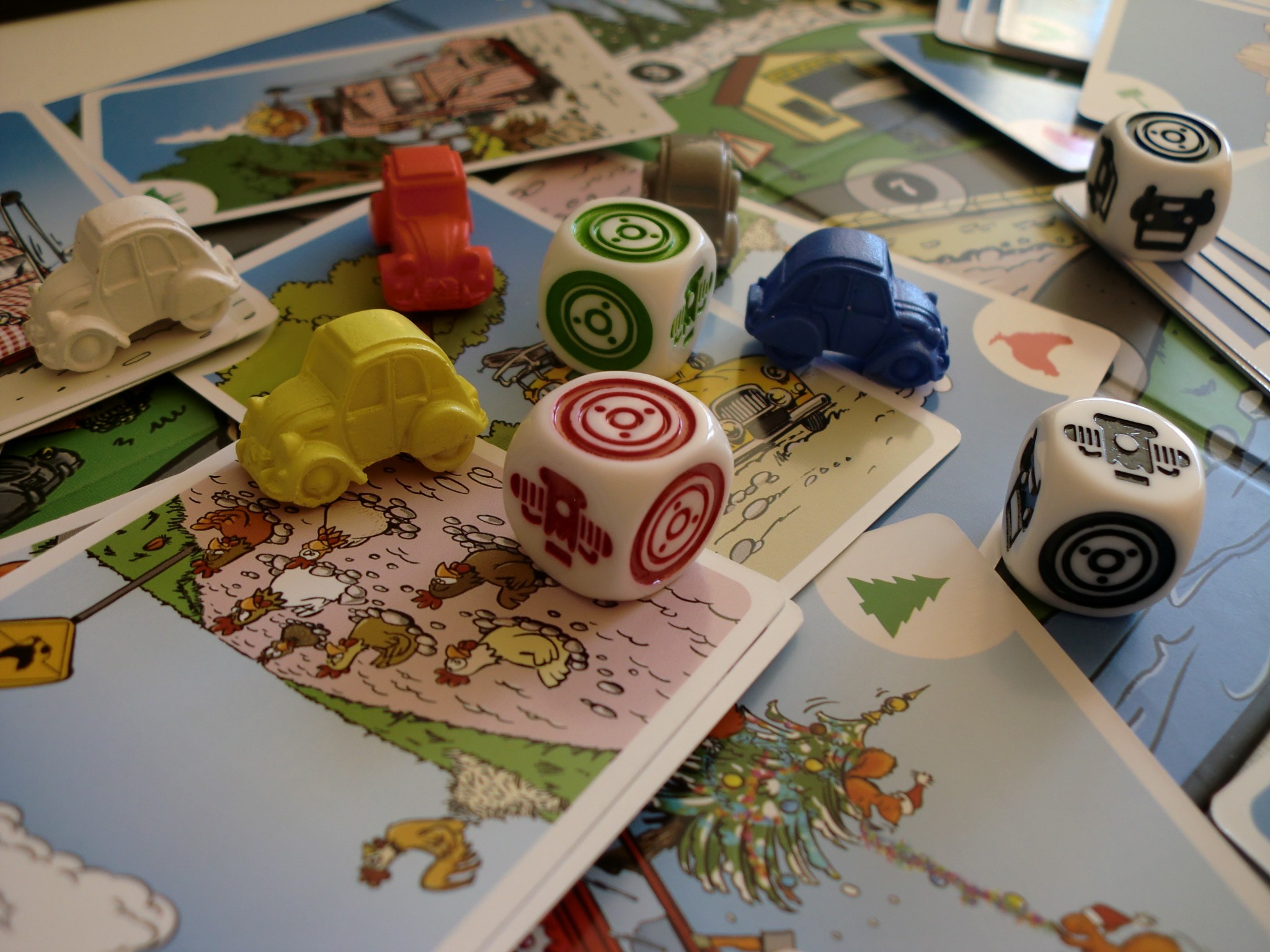 Chaque joueur reçoit 4 cartes, le reste allant au centre pour constituer la pioche. À son tour le joueur pourra jouer 1 carte et lancer les dés. Pour la carte, il pourra s’agir d’une carte Embûche, à jouer sur un autre joueur ou une carte Solution pour jouer sur soi, afin de se débarrasser justement de l’une des embûches. Il sera aussi possible de défausser une carte de sa main pour en tirer une nouvelle. Pour les dés, en obtenant 2 faces 2CV, vous pourrez faire avancer votre voiture d’autant de cases que de faces obtenues. Par contre le nombre de dés lancés dépendra du nombre d’embûches qui se trouve devant vous, un de moins par carte. Le jeu se poursuivant ainsi jusqu’à que l’un des joueurs franchisse l’arrivée.