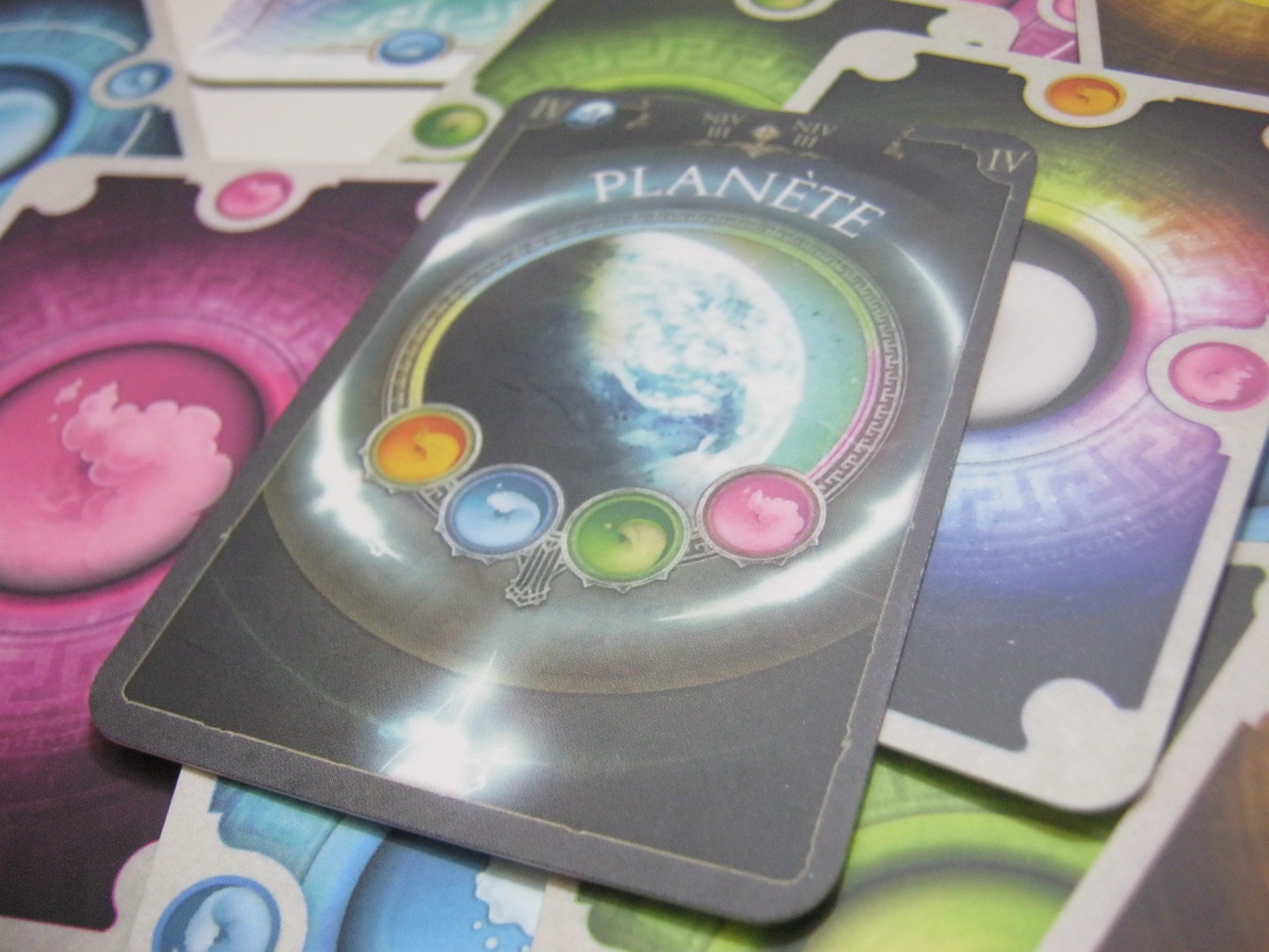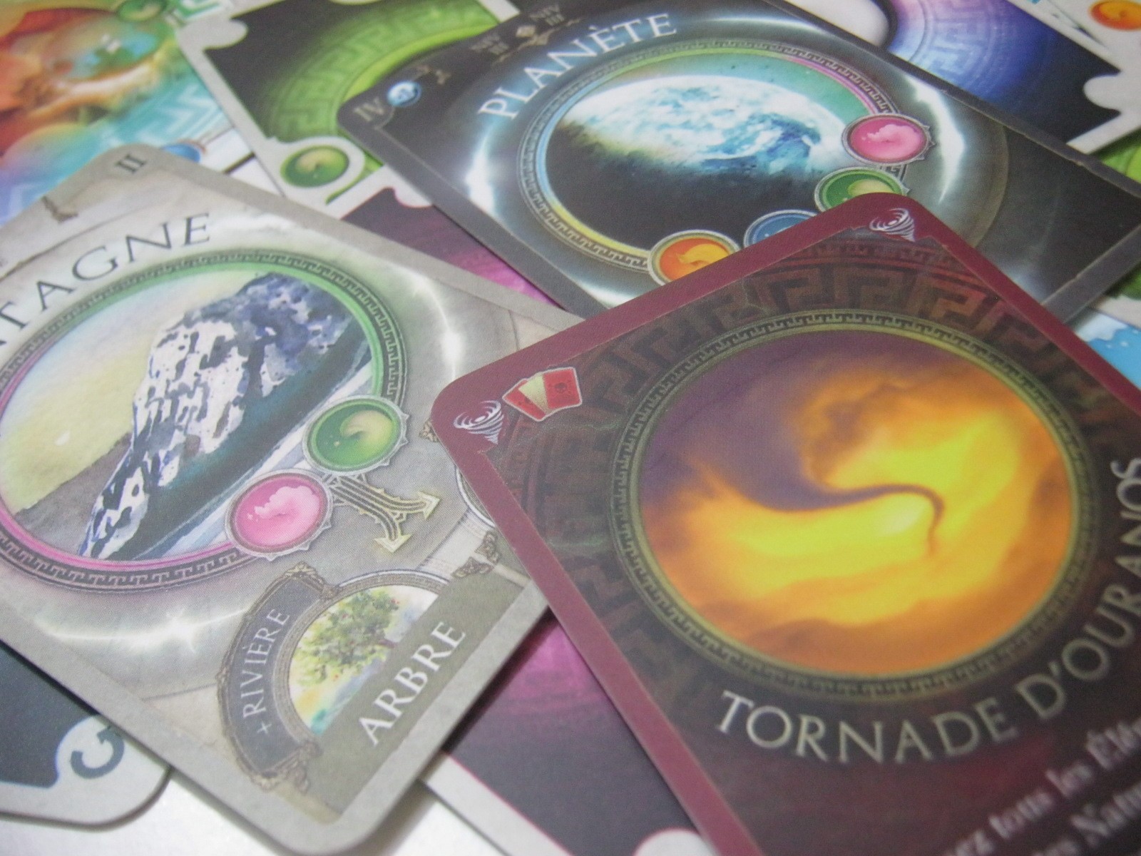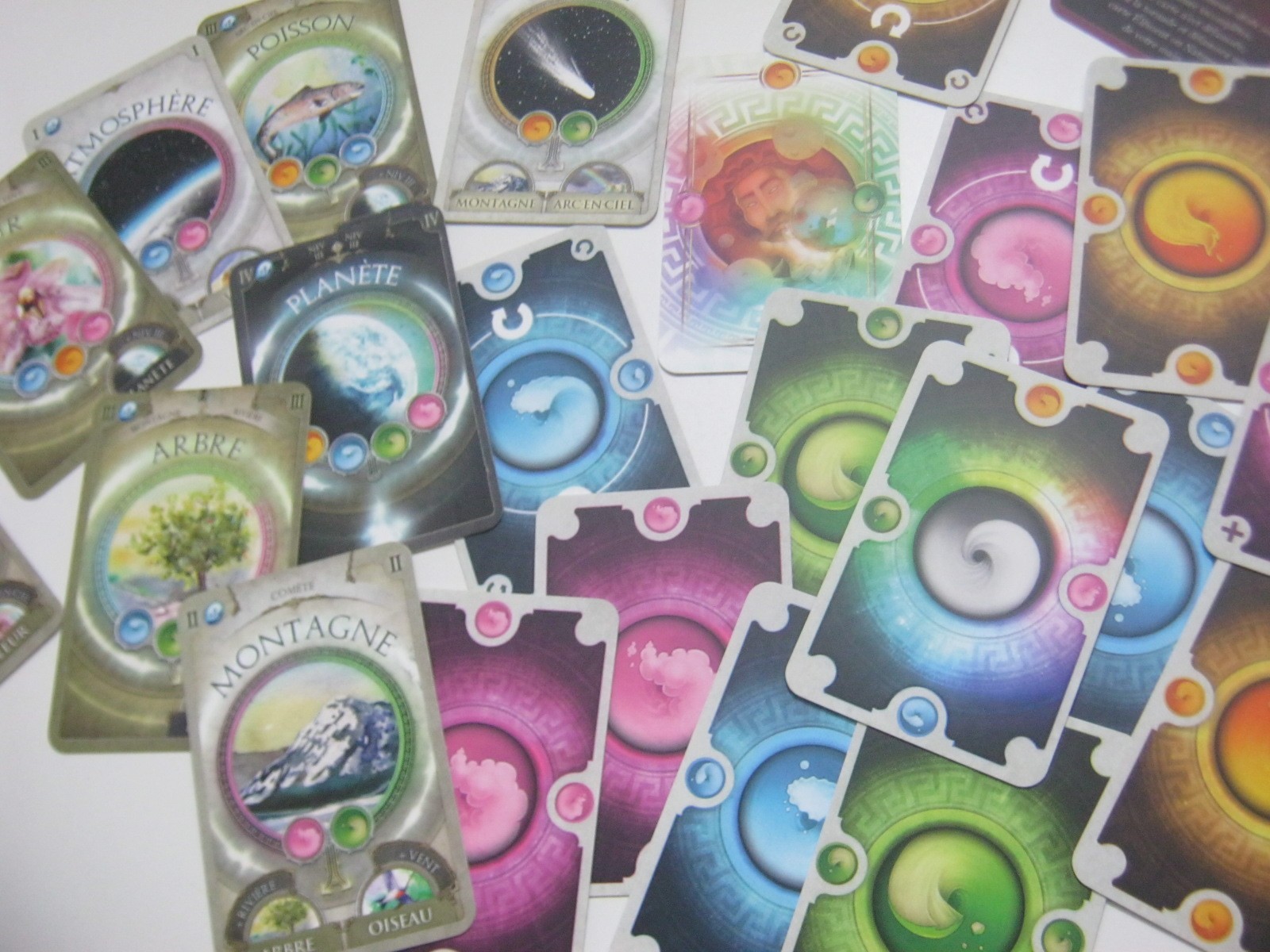 Les règles n’ont pas beaucoup changé, votre but est toujours de former une planète la plus à même d’accueillir la vie. Pour cela vous allez distribuer toutes les cartes entre les joueurs, et ces derniers devront alors en sélectionner et jouer une à chaque tour, et cela, sans se concerter, sauf s’ils jouent des énergies. Il s’agit donc d’un jeu coopératif à partir de 3 joueurs, où la logique et la coopération muette seront au centre de l’expérience de jeu. Mais voilà la tâche ne sera pas aisée, car vous trouverez deux styles de cartes à jouer, les cartes Nature qui ne pourront être jouées que dans un certain ordre (en suivant l’arbre des évolutions), et les cartes Element qui vous permettront de finaliser ces cartes Nature en apportant l’énergie nécessaire. Malheureusement, vous trouverez aussi des cartes agression qui seront là pour vous mettre des bâtons dans les roues. Surtout que vous serez obligé de les jouer, puisque le jeu se termine lorsque toutes les cartes ont été jouées ou si la carte planète a été complétée. Votre réussite étant chiffrée selon les cartes que vous avez réussi à jouer, faisant office de score.