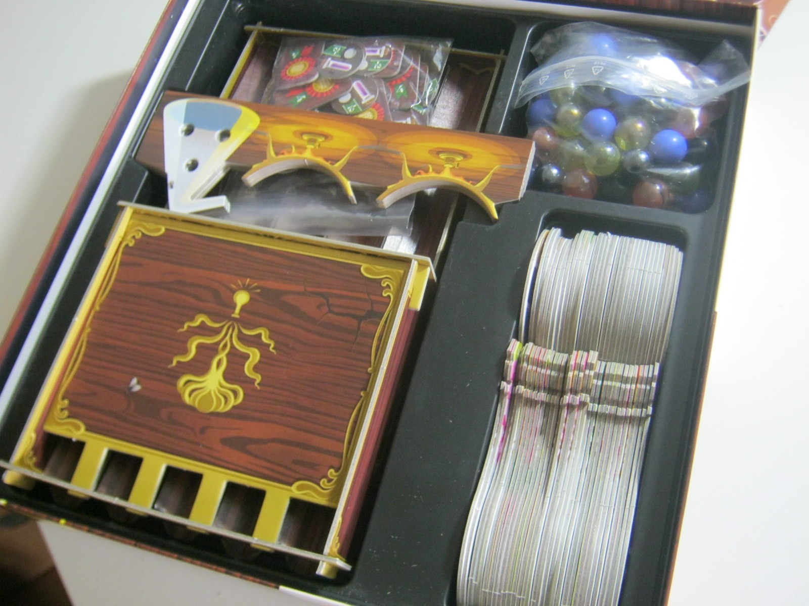 Il est temps de vous parler un peu du matériel, tant celui-ci attire l’œil et participe au plaisir de jeu. Vous aurez donc le plaisir de monter le fameux distributeur avant d’entamer la première partie. Un élément assez facile à construire avec un peu de patience, et qui trouvera naturellement sa place dans la boite une fois montée, et qui ne demandera pas à être remonté à chaque partie, un plus bien appréciable. De plus, vous trouverez un sachet de billes en verre bien garni, dommage que celles-ci soient un peu terne, mais je chipote. Les paillasses et autres potions, très nombreuses, ne sont pas non plus en reste en termes de qualité. Mais je ne vous cache pas que le distributeur avec son réapprovisionnement par le dessus est un objet qui attire tout de suite le regard.