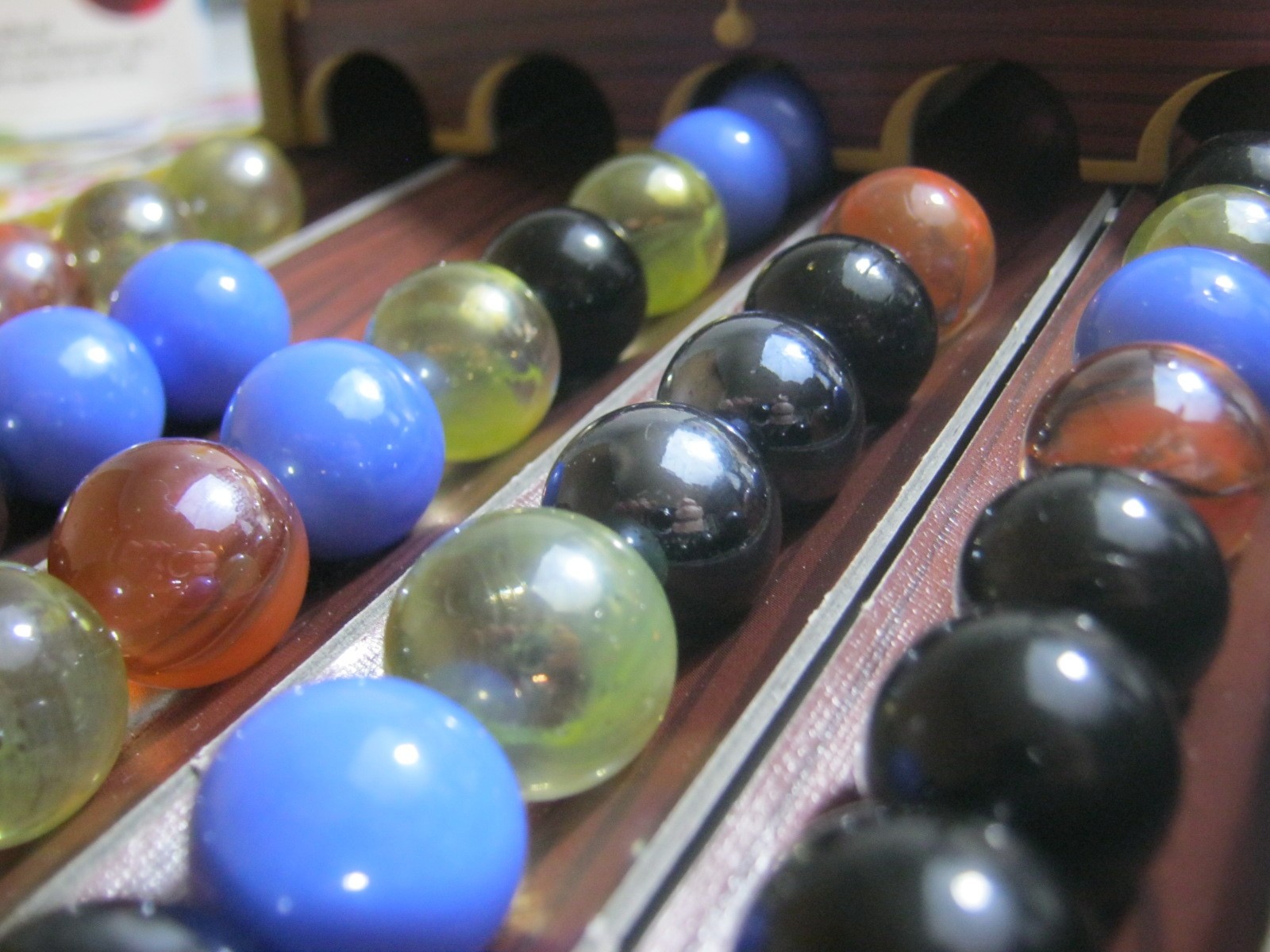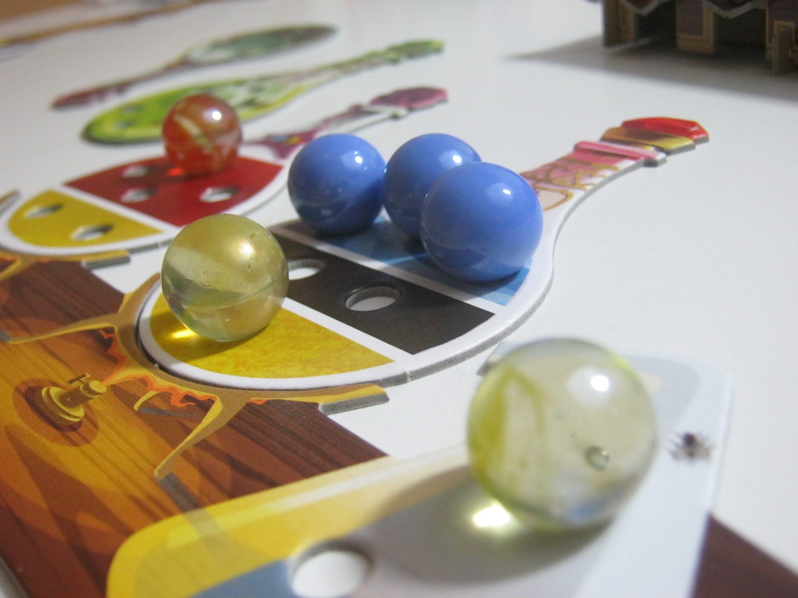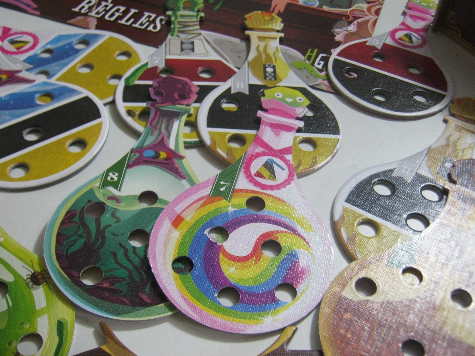 Chaque joueur a devant lui sa paillasse et ses potions, son regard est vif, le jeu peut commencer. Une bille est prise dans le distributeur, faisant se percuter trois billes jaunes, qui font faire le bonheur de son propriétaire, qui s’empresse de les ajouter à ses potions. Le joueur suivant n’est pas en reste en faisant se percuter lui aussi trois billes qui en se retirant vont provoquer une seconde explosion, qui à leur tour vont faire exploser d’autres billes. Grâce à cette réaction en chaine, une potion est terminée, rapportant des points. Elle sera bue quelques tours plus tard afin de profiter de quelques billes supplémentaires. Les autres joueurs font de même en récupérant les précieuses essences monstrueuses. Les potions commencent à s’accumuler sur le côté, et les pouvoirs de vol de billes ou de tours supplémentaires sont bien utiles pour enchainer l’accumulation des points. C’est une farandole de fioles de toutes les couleurs qui s’étalent de toute part. Tandis que les colonnes vides du distributeur se remplissent sous le son des billes qui se déversent au hasard.Chaque joueur reste attentif en attendant son tour, car la donne offerte par le distributeur change à chaque tour. Les potions s’entassent contrairement à la pile de points de compétence qui elle s’amenuise. Pour cette partie la quantité de pions est plutôt basse afin de réaliser une partie rapide, mais il est parfaitement autorisé de modifier la quantité. La fin approche à grands pas, les dernières billes sont récupérées, et dans la foulée la dernière tuile de compétence. Chaque joueur compte ses points minutieusement, mais un seul seulement sortira avec son diplôme.