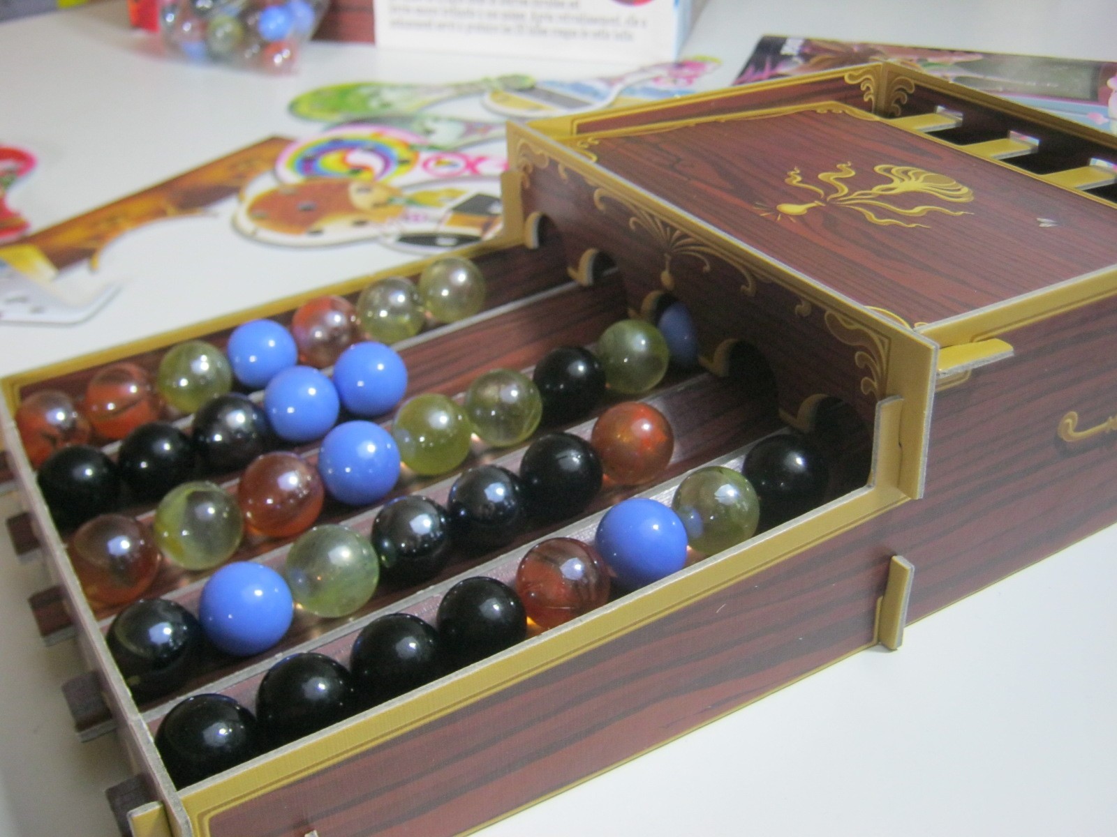 Certains pourront trouver le design du jeu « spécial » avec son vert et son rose omniprésent sur l’illustration de la boite, pour ma part cela ne m’a pas gêné bien au contraire. Je trouve celui-ci moins lisse que ce que l’on trouve habituellement, ce qui aura, je l’espère, le mérite de le faire ressortir sur les étalages. Le style est assez cocasse et se marie, je trouve, très bien avec le jeu. Le matériel est vraiment de qualité, surtout que celui-ci se range parfaitement dans la boite, avec ses emplacements spécifiques. Tout rentre sans problème, ce qui est bien agréable. Par contre même si vous tentez de le faire, ne rangez pas les billes dans le distributeur, mais à part, sous peine de le faire s’écrouler sous le poids de celles-ci, lorsque vous tenterez de le sortir de la boite. Un excellent travail d’édition qui met véritablement le jeu en avant.