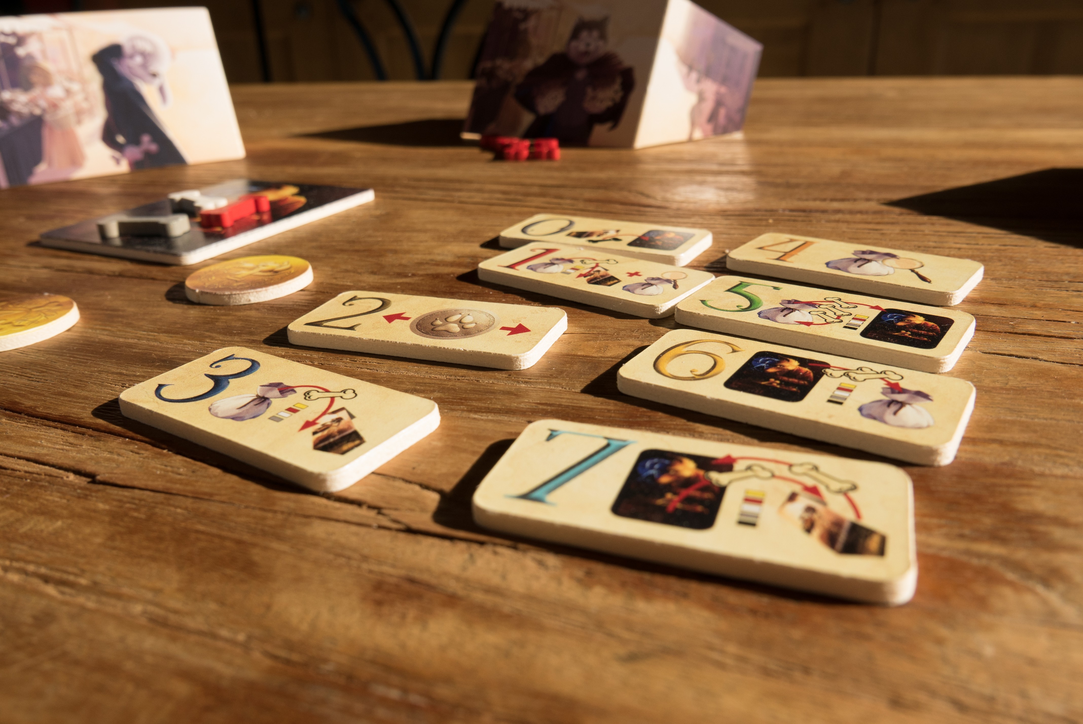 Croire qu'il n'est question ici que d'un jeu de pari et de chance, c'est sous-estimer les choix que vous aurez à faire durant toute la partie. Car à chacune des 8 tuiles numérotées est associé un effet différent : regarder dans le sac, échanger des os, choisir le premier joueur de la prochaine manche, faire amende honorable auprès de Fagin… autant de possibilités tactiques qui ne cantonne pas votre choix à un simple chiffre et à l'envie de piocher avant les autres.