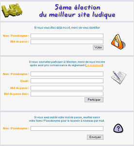 La chose avait été initiée par Monsieur Xavo, de la Guilde, avec comme pitch de pour attirer du monde "l'élection du meilleur site du web ludique". En fait, depuis, c'est plutôt pris comme une évaluation des sites ludiques de qui est ce qui est bien ou qui manque. En effet, il y a un petit formulaire à remplir et vous devez visiter un certain nombre de sites pour que votre "vote" soit pris en compte. Du coup, ça mete en avant des sites peu connus et ça donne des indications de retours aux webmestres sur leur travail.