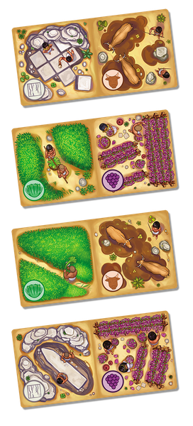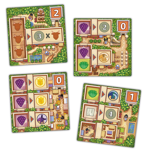 Dominos qui représentent une combinaison de duo des 4 ressources du jeu : les bovins, la fleur de papyrus, l'albatre et le raisin.