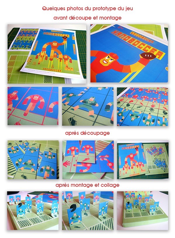 Handsoccer tient sur 3 feuilles qui une fois découpées et montées facilement ,en moins de 10 minutes, forment une boite avec les règles et le plateau accompagné de pions. Facile à ranger et à transporter.