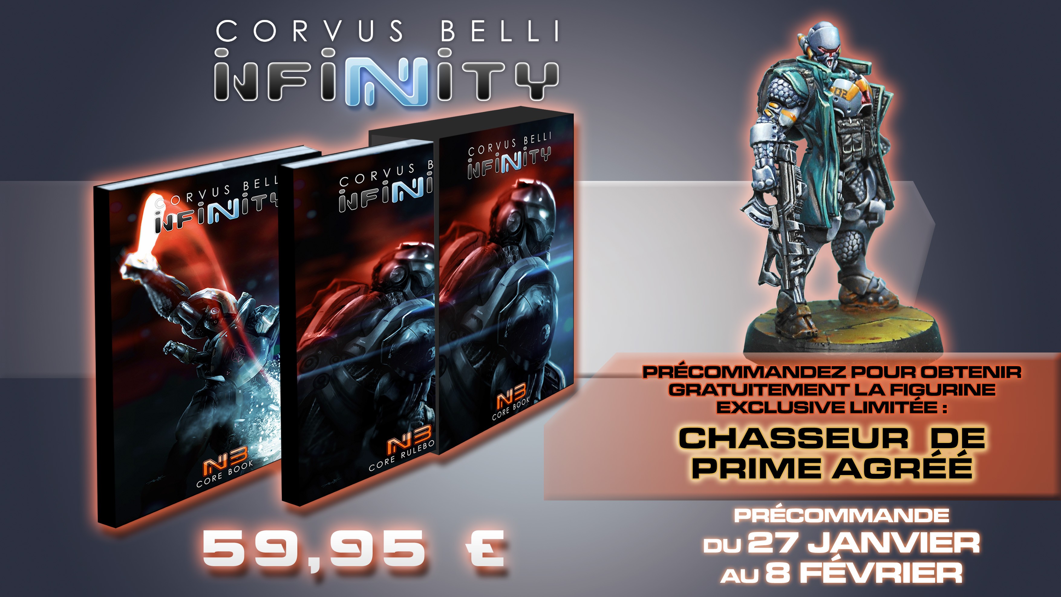 Corvus Belli ont bien tenu leur promesse de nous fournir une « vraie » version Française des règles d’Infinity, et plus tôt que prévu ! Vous allez bientôt pouvoir acquérir les 2 livres complets avec une box de rangement et, en guide de remerciement, la figurine Edition Limité du Chasseur de Prime Agréé !