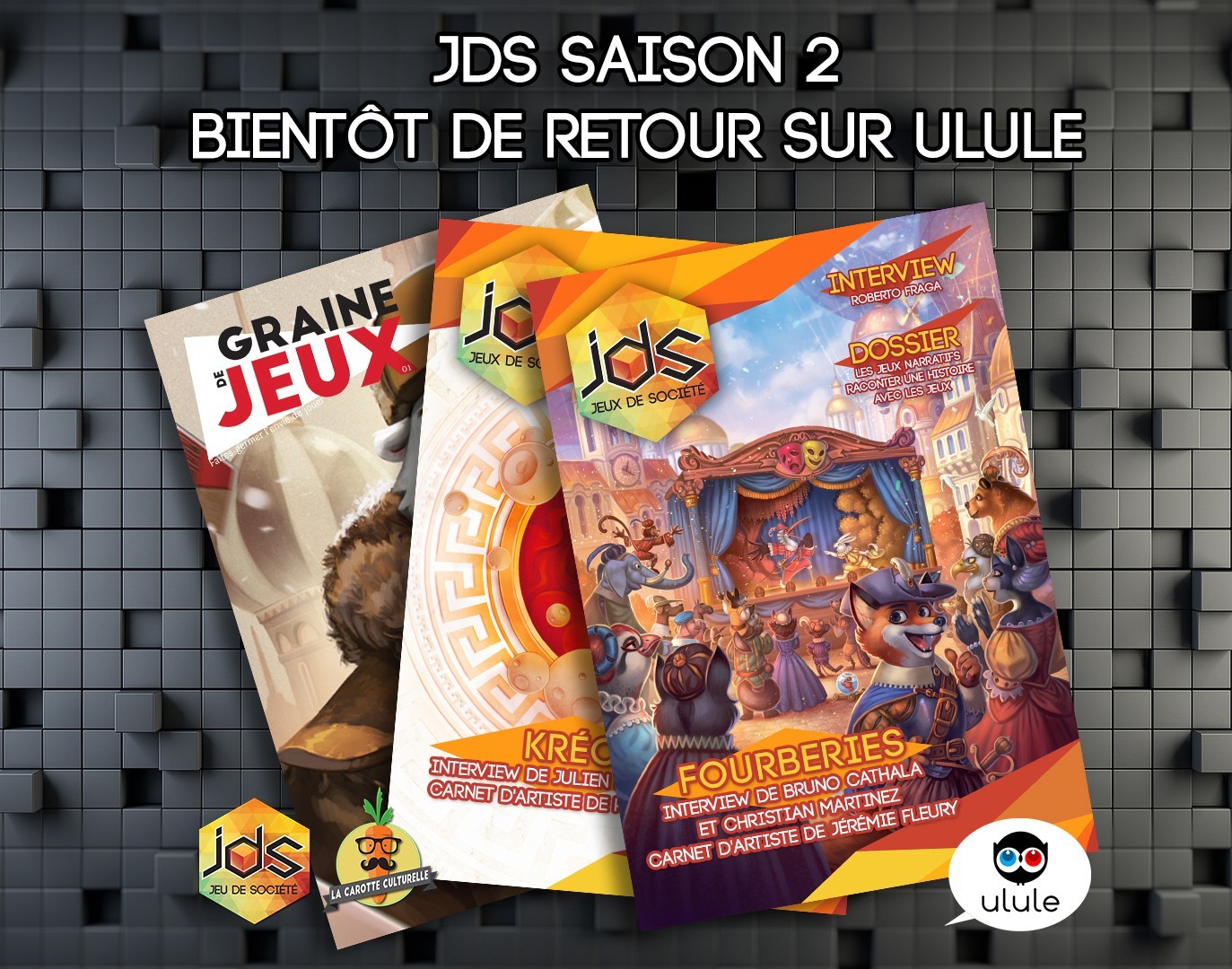 Après 4 numéros de JDS pour la première saison (qui fut financé de diverses manières via Ulule, toujours avec succès), JDS revient pour une seconde saison ! Cette fois-ci se sont 6 numéros qui vous seront proposés pour un abonnement de 1 an. Mais ce n’est pas tout, car pour combler l’absence de JDS tous les 2 mois, nous vous avons concocté une petite surprise, un petit frère plus axé actualités nommé : Graine de jeux. Véritable tremplin pour ceux qui découvriraient les jeux de société, et mine d’informations pour les joueurs plus aguerris, personne n’est oublié.