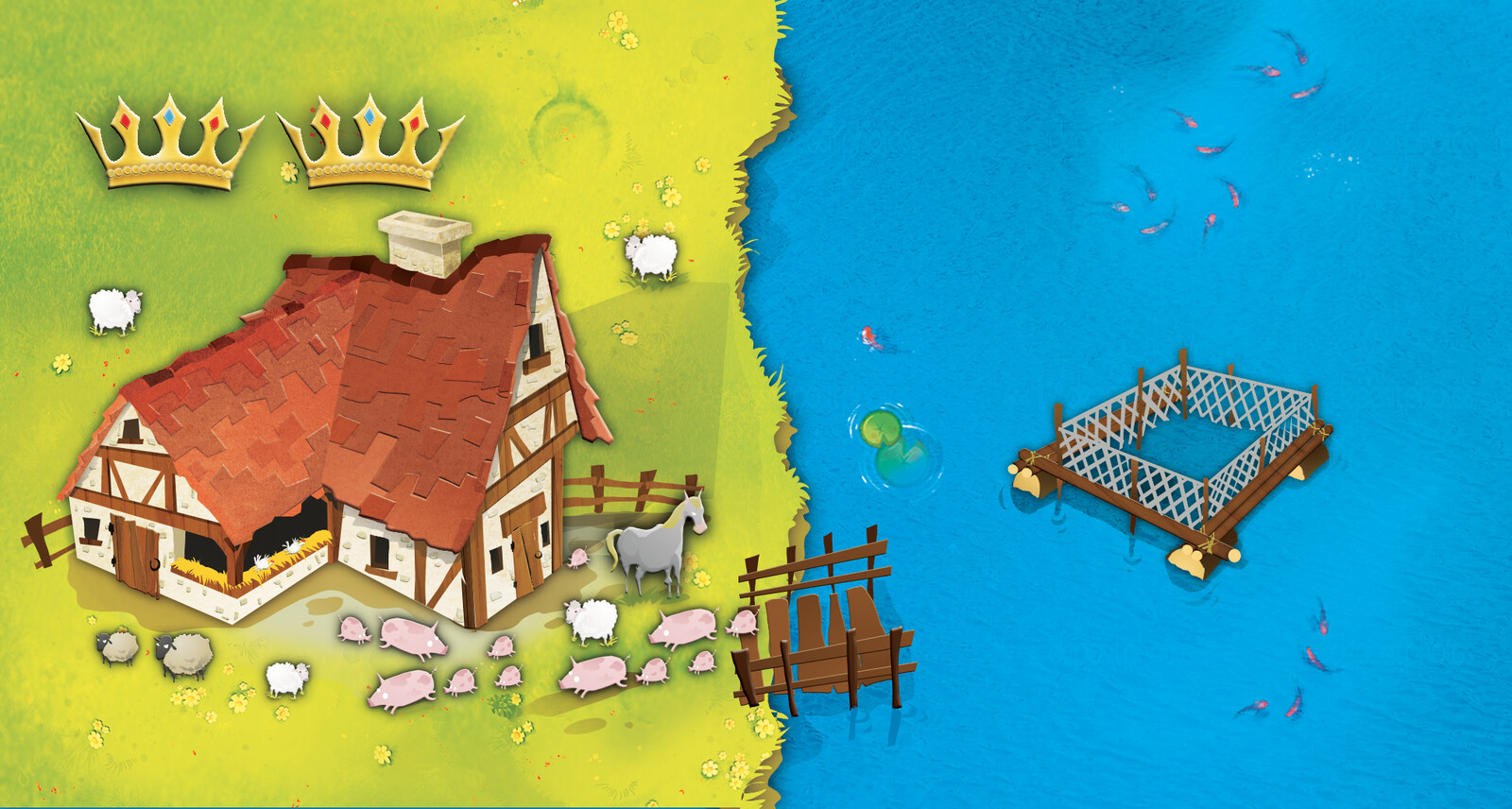 Dans les parties à 2 joueurs, le positionnement de deux pions à sa couleur par tour, permet de garder et le rythme et l'intérêt de l'affrontement. Enfin, le fait de pouvoir envisager des points bonus si votre château termine au centre de votre royaume, si votre royaume n'a aucune tuile retournée ou en cumulant 3 manches lime l'aspect aléatoire des tirages et renforce le côté stratégique.