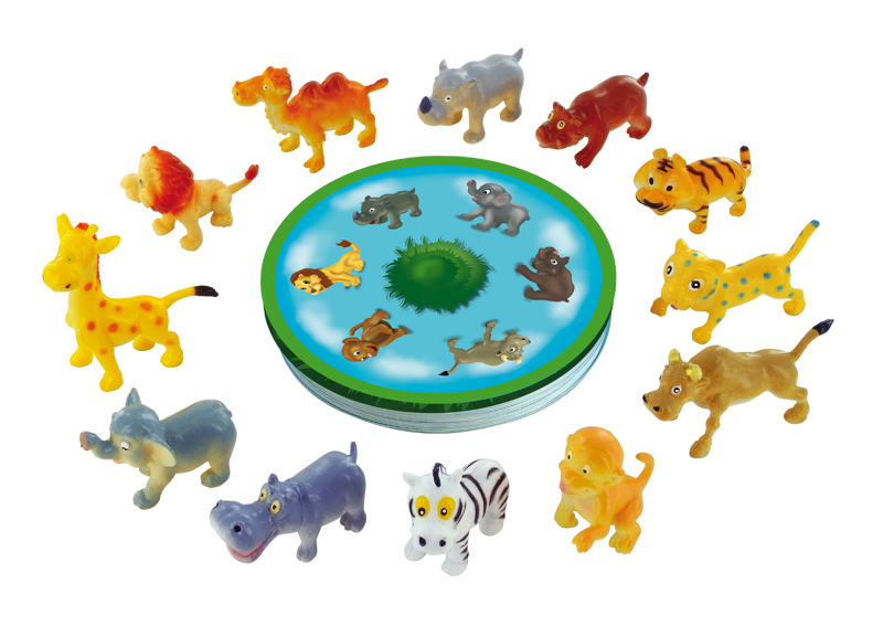Au centre de la table une mare, autour douze figurines d’animaux, sous la mare des cartes.