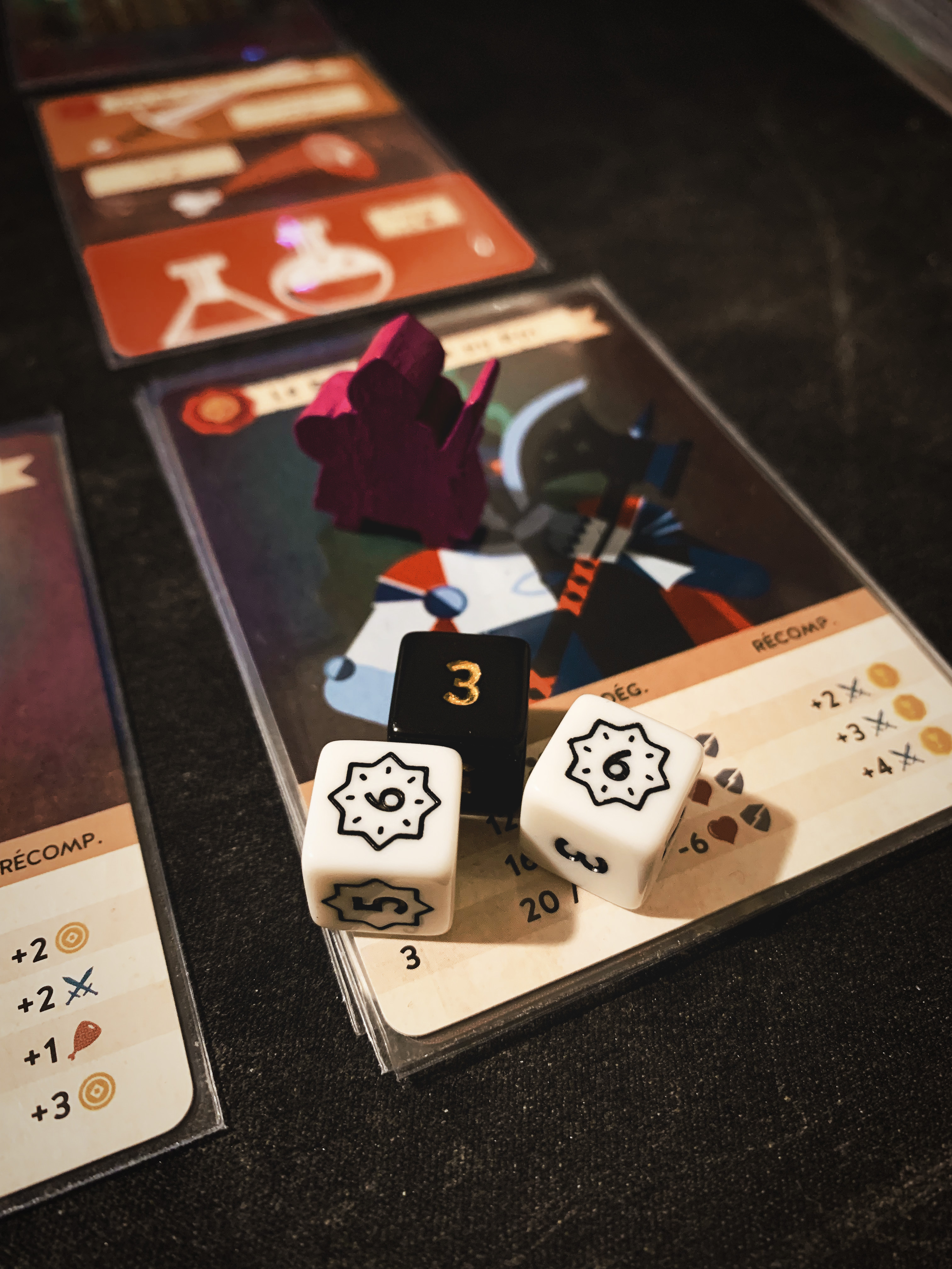 Je vous parlais de moments compliqués dans la lecture des règles plus haut. C'est un frein, un réel frein à la découverte et au plaisir d'un jeu. Julien et moi avions essayé Mini Rogue la semaine dernière. Nous avions trouvé les règles assez compliquées. Nous avons donc donné le jeu à Guillaume qui lui, connait bien ces mécanismes. Nous tournons ce matin une vidéo spéciale sur ce jeu pour vous le faire découvrir. En régie, nous restons scotchés à sa présentation et en voulons plus. Après le tournage, pendant la pause déjeuner, nous allons de suite dans une boutique orléanaise (Bella Ciao) leur acheter leurs trois exemplaires de Mini Rogue qu'il leur reste. Non mais regardez-moi ce lancer de compétition ! Dans Mini Rogue, le 6 blanc est à relancer pour ajouter le numéro suivant au score des dégâts (attention, si c'est un échec, vous perdez votre premier 6) j'ai pété le monstre d'un coup ! Avec Philibert, notre partenaire, nous parlons de faire quelques articles de fond. C'est toujours chouette de retomber sur ce genre de publicités. La nostalgie de la première génération est toujours présente chez moi. C'est une journée d'essai, nous jouons à la nouvelle version de Mascarade de Bruno Faidutti. L'ambiance autour de la table est à la manipulation, la trahison et l'égoïsme. Un jeu qui fait plaisir à jouer. D'ailleurs, bientôt, Bruno Faidutti sera sur notre plateau pour vous en parler.Je rêve me direz vous, je tutoie l'espoir de réussir à découvrir ces deux boites d'initiations. Mais le temps me manque tellement, j'ai beaucoup de travail à Tric Trac et les journées ne sont pas assez longues. Qui sait, comme disait Germain, on va peut-être avoir le temps de jouer le Jeudredi.