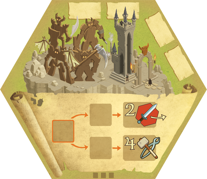 - Les résolutions se feront alors dans l'ordre : D'abord les explorations (piocher une tuile, l'orienter et éventuellement en appliquer l'effet comme pour l'Autel des Dieux Anciens) ; ensuite les combats lorsque des Meeples adverses se trouvent sur le même terrain. Il s'élimine à raison de 1 pour 1 jusqu'à ce qu'il ne reste plus qu'une couleur au maximum. L'attaquant prend 1 point de Bravoure par Meeple détruit et le défenseur, 1 point de Bravoure par paire de Meeples détruits. Tous les 7 points de Bravoure, un point de victoire est gagné ; Enfin, les bâtiments dont les défenses sont submergées sont détruits et les Meeples ayant participé à ce carnage (positionnés sur les défenses) deviennent des points de victoire sur la Montagne de la Renommée de leur propriétaire.
