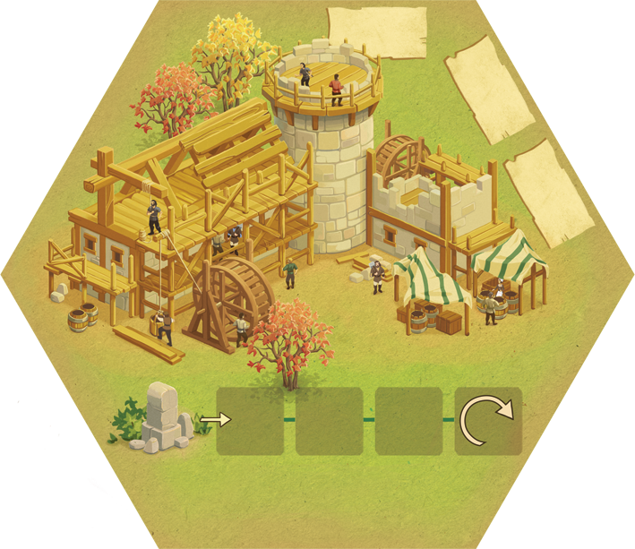 - Les bâtiments dont l'ouvrier est en bout de piste active l'action illustrée : Construire de nouveaux meeples qui s'en vont rejoindre votre entrepôt ; Armer des meeples de l'entrepôts qui s'en vont rejoindre la Porte de la cité, prêts à explorer et combattre ; Mise en chantier d'un nouveau bâtiment ; Catapultage sauvage ; Productivité accéléré ; Recyclage ou même Conversion... vous aurez l'embarras du choix !