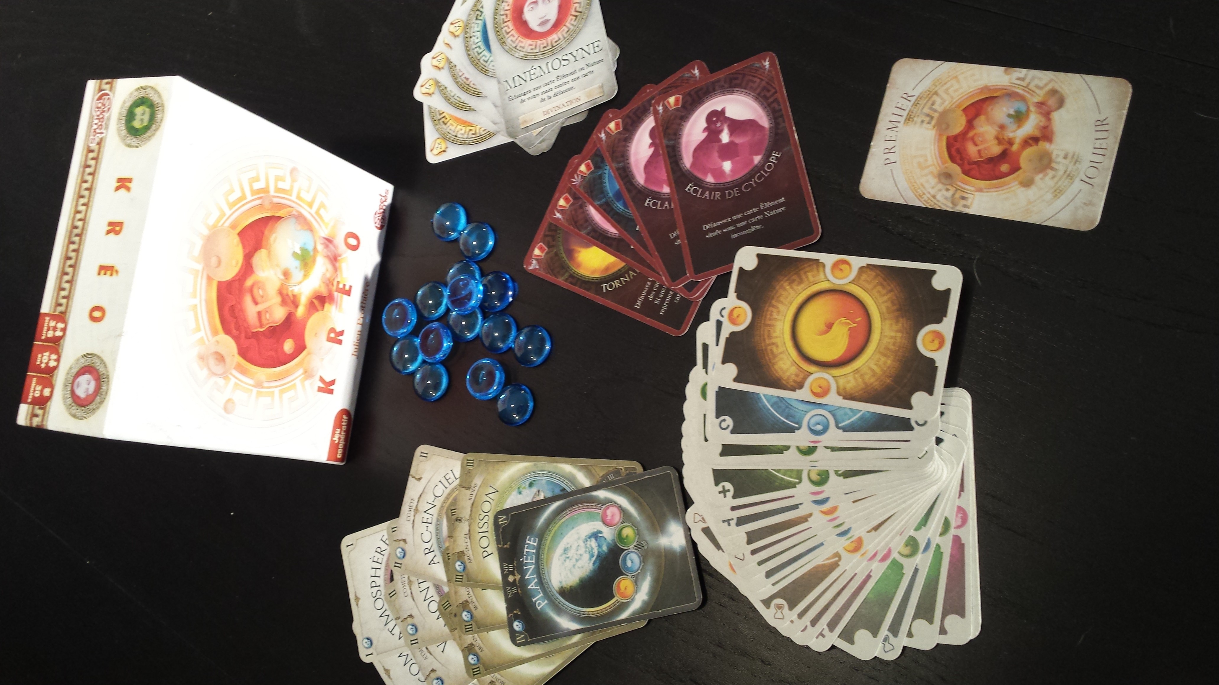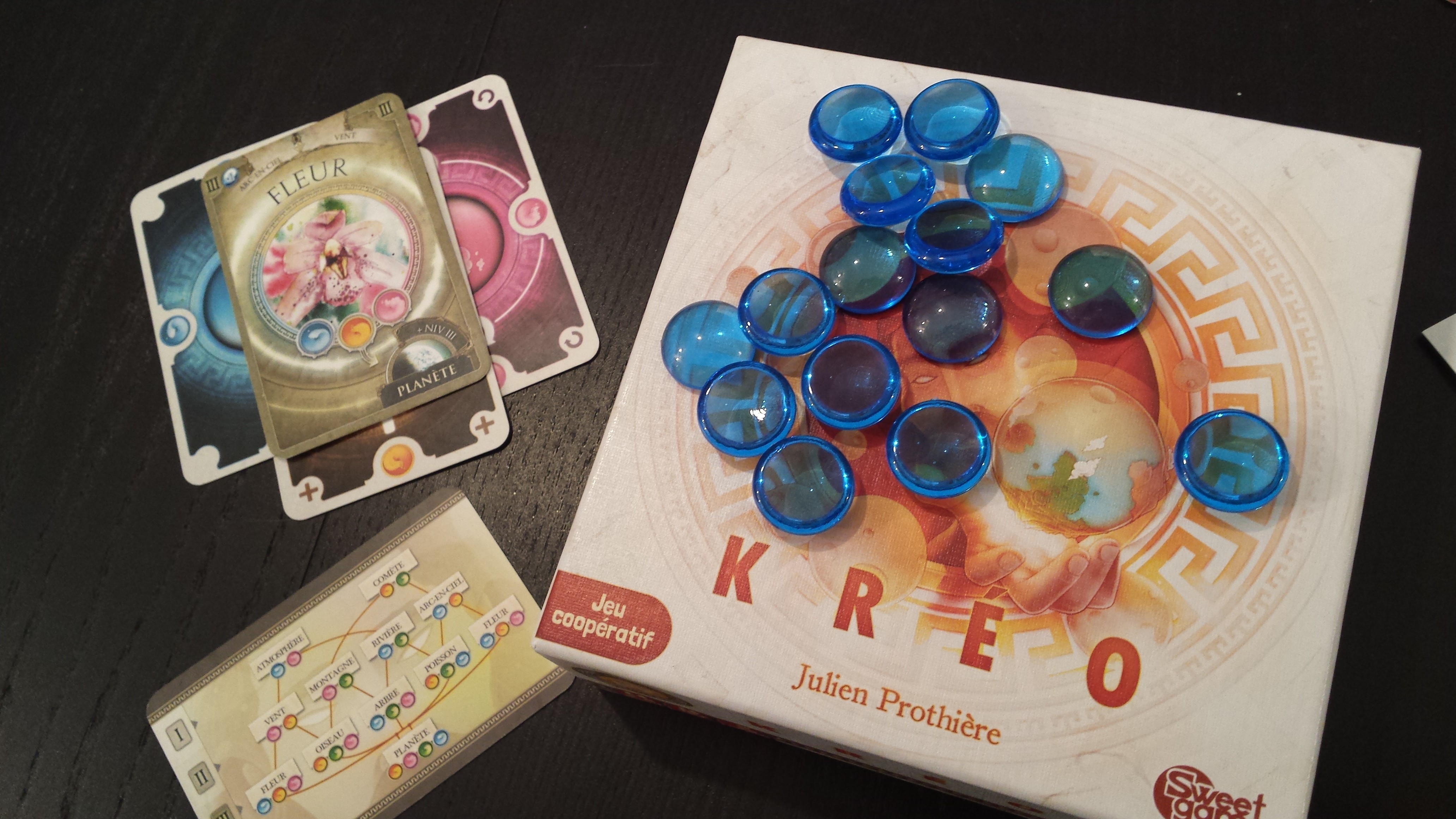 Description : Kréo est un jeu de carte coopératif où les joueurs vont utiliser déduction et intuition afin de poser leurs cartes en jeu et collaborer à la création d'une planète idéale et viable et prouver ainsi votre puissance en tant que dieux titans. Tout comme les jeux Hanabi et The Grizzled, édité lui aussi par "Sweet november", Kréo invite les joueurs à communiquer que par l'utilisation de ressources limitées soit, dans ce jeu, par les gemmes d'énergie.