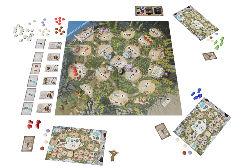 Ensuite nous pourrons nous recueillir à plusieurs même, sur le plateau de jeu pour en récupérer un aussi, construire nos tentes, à l'aide de bois et de peaux (plus on en fait, plus les gens sont contents, plus on est généreux!), donner des repas à notre tribu (de la viande pour 2 pts ou des champignons pour 1 pt), fabriquer toute sorte d'artisanat, dont les arcs, les tambours et les vêtements (les cartes requérant des ressources avec dessus des points et une combinaison de trois différentes apportant un bonus de 5 pts), et enfin mon préféré : ériger le plus beau totem ! Pour ce totem, à bâtir au centre de votre plateau individuel, il faudra être le plus prompt au cours de la partie, car une course effrénée en temps réel va s'amorcer. Offrant des points positifs au plus grand et des points souvent négatifs au plus petit. De plus, si vous souhaiter "crâner", si vous agrémentez vos ressources de bois, essentielles à la construction de votre objet de désirs avec de jolis crânes ornementaux alors vous serez récompensé par des bonus non négligeable par tronçon de 2 bois et d'un crâne. Mais cette ressource est très rare et convoitée. Et oui même en matière les totems, il n'y a pas que la taille qui compte !