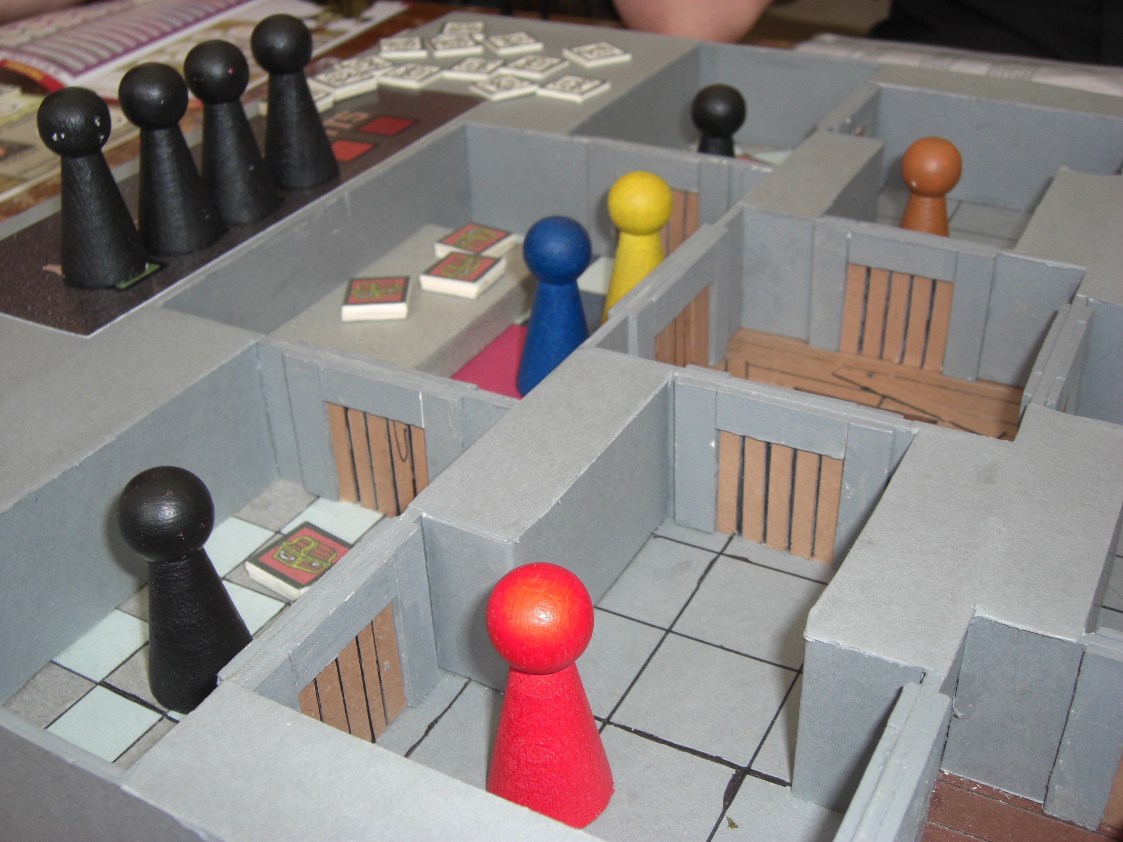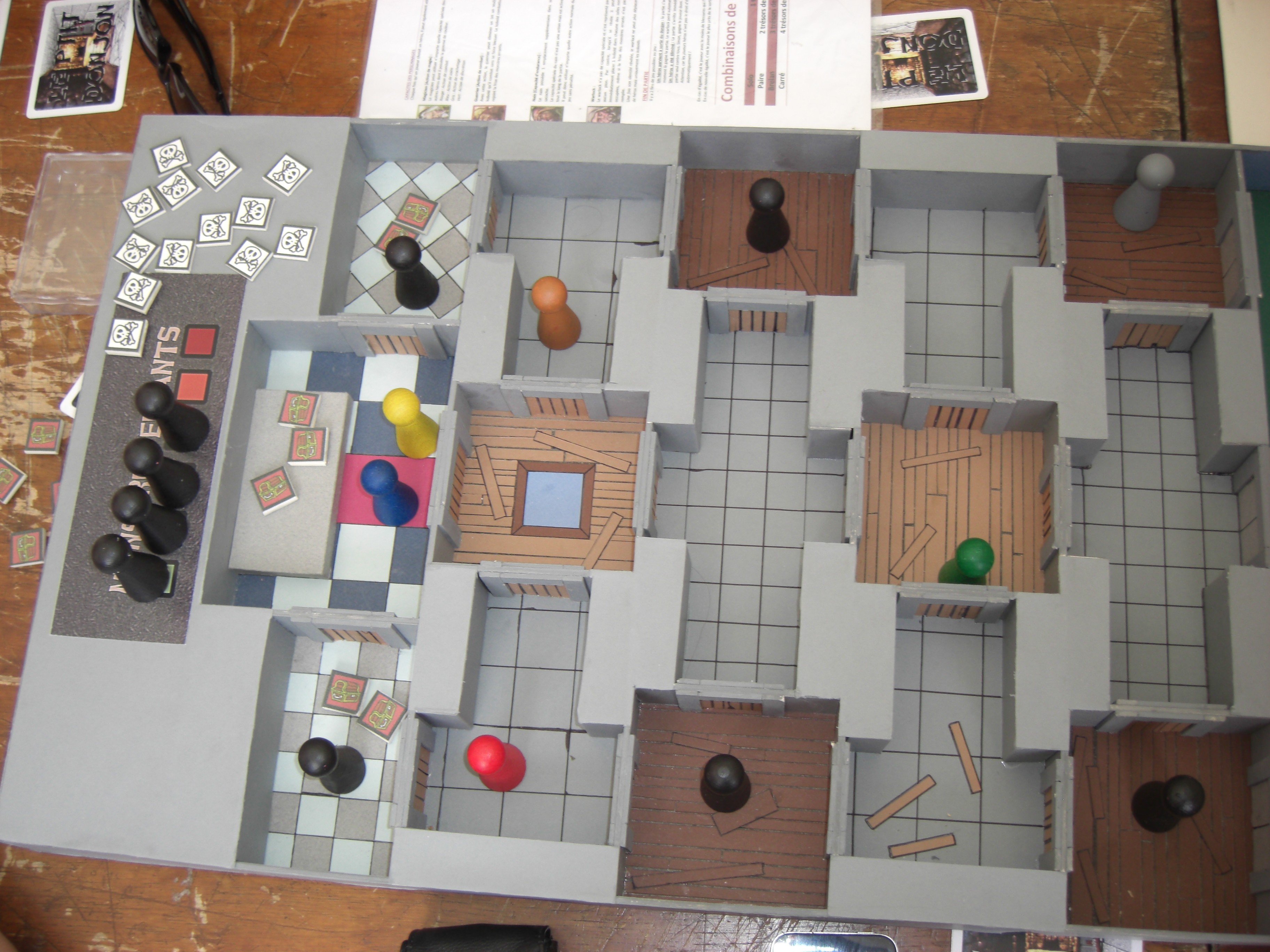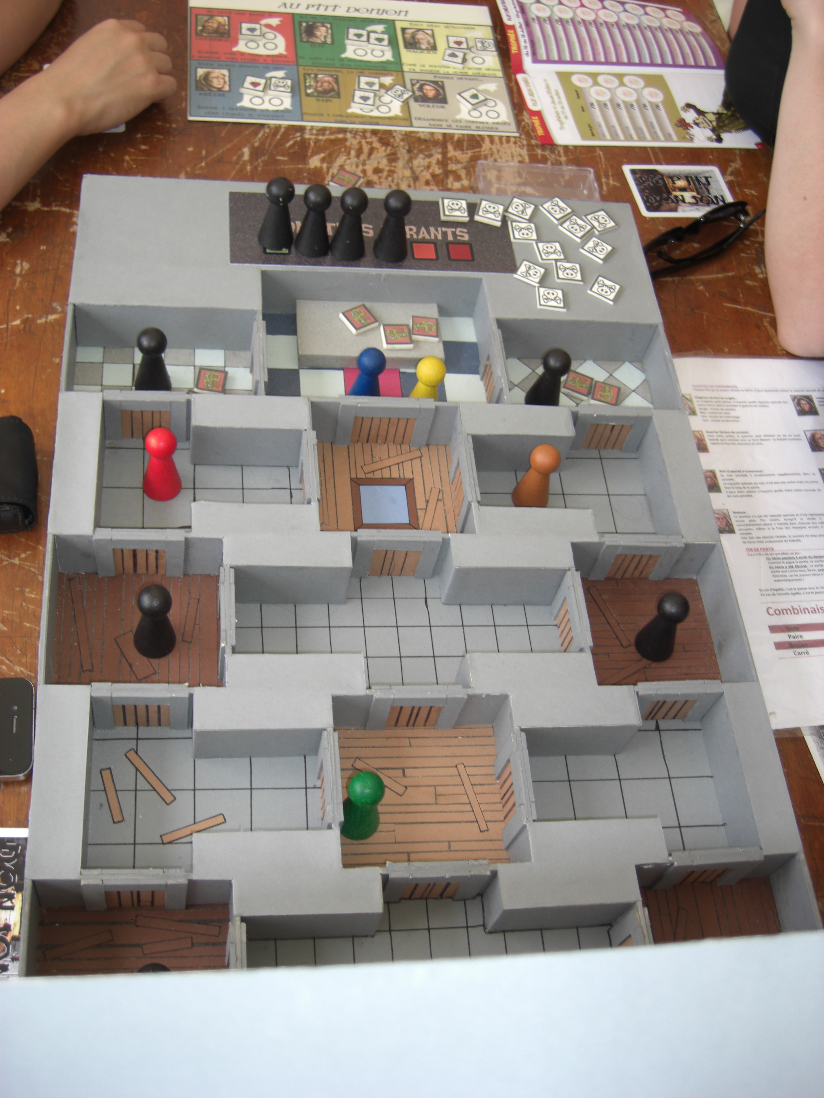 Comme un jeu semi-coopératif. Car il y a des rôles cachés : chaque joueur incarne un héros, ou bien le méchant warlock qui remporte la partie dès qu’un héros est tué. Et les héros sont en concurrence les uns avec les autres : il n’y aura qu’un seul vainqueur, celui qui parviendra à posséder le plus de gemmes au moment où l’un des héros aura pu s’extraire du maléfique donjon. En cas d’égalité sur les gemmes, c’est le plus proche de la sortie qui remporte la partie. On a donc une double condition de fin de partie, un petit peu de « stop ou encore » et un semi-coopératif concurrentiel comme Dead of Winter.