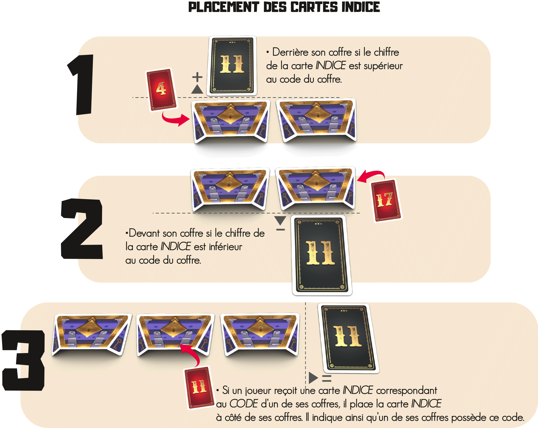 Lorsqu’un joueur reçoit une carte INDICE, il doit immédiatement la placer devant ou derrière un de ses coffres en respectant les règles suivantes :