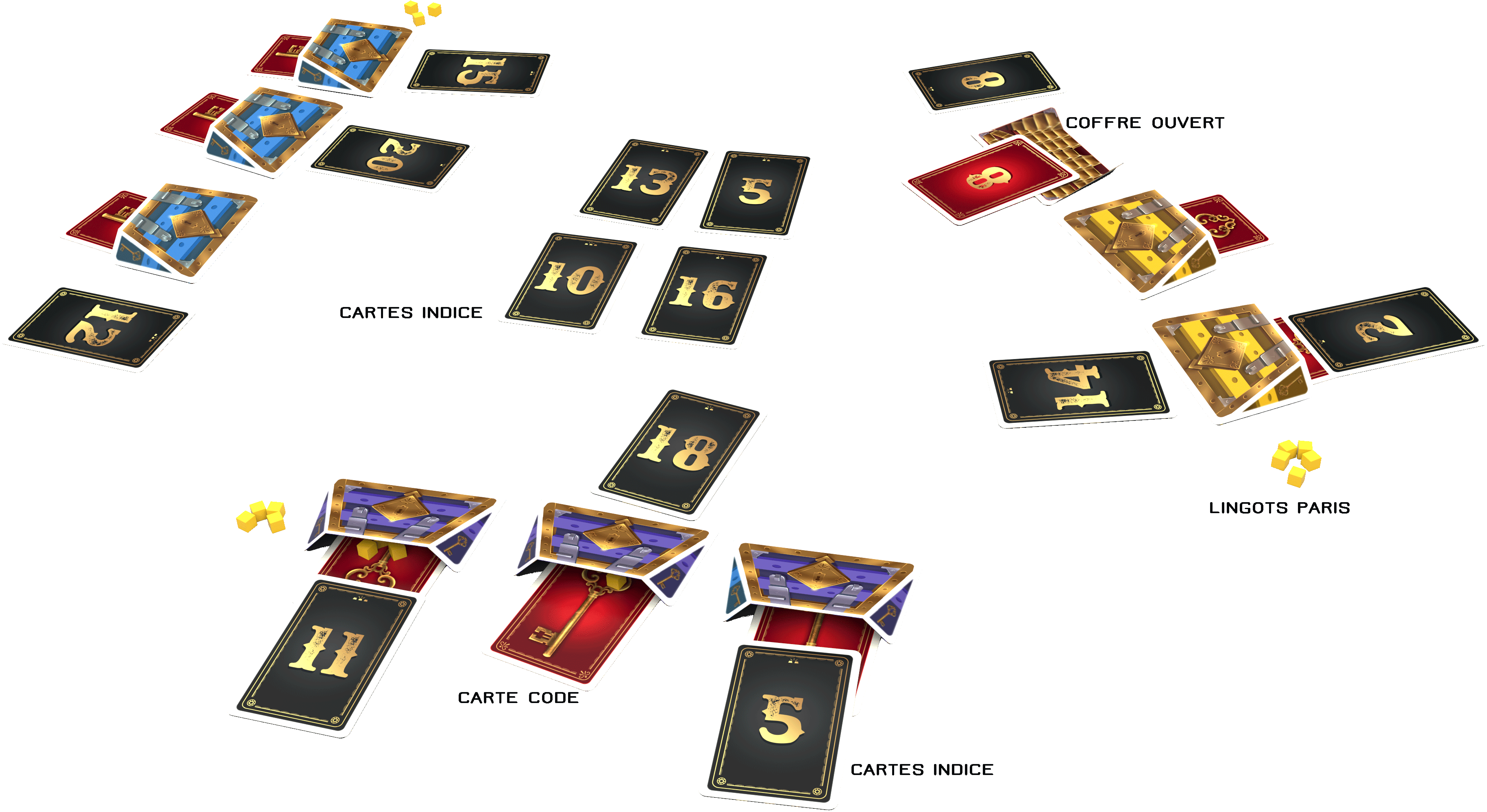 Chaque joueur-voleur possède 3 coffres remplis de lingots verrouillés par un code unique.