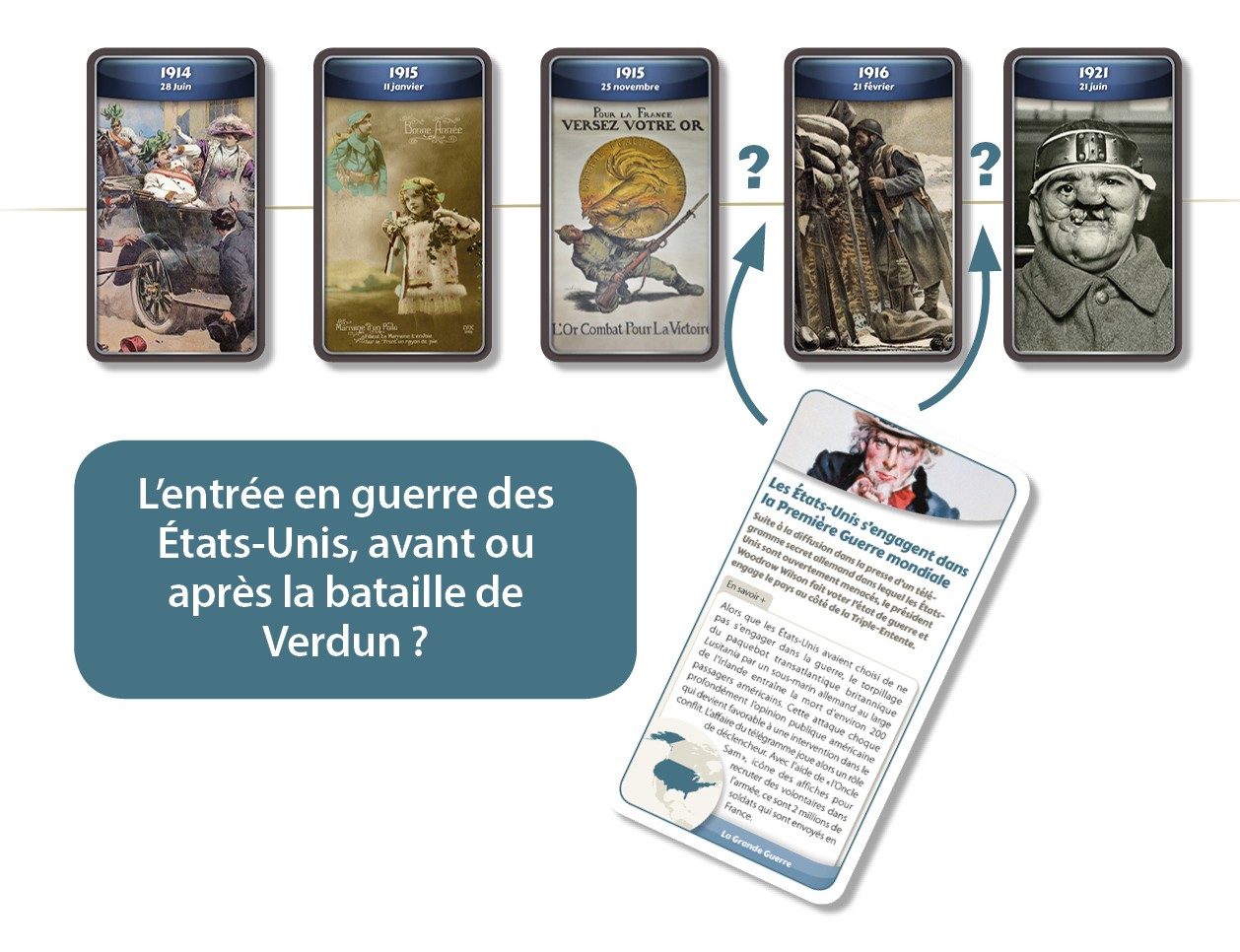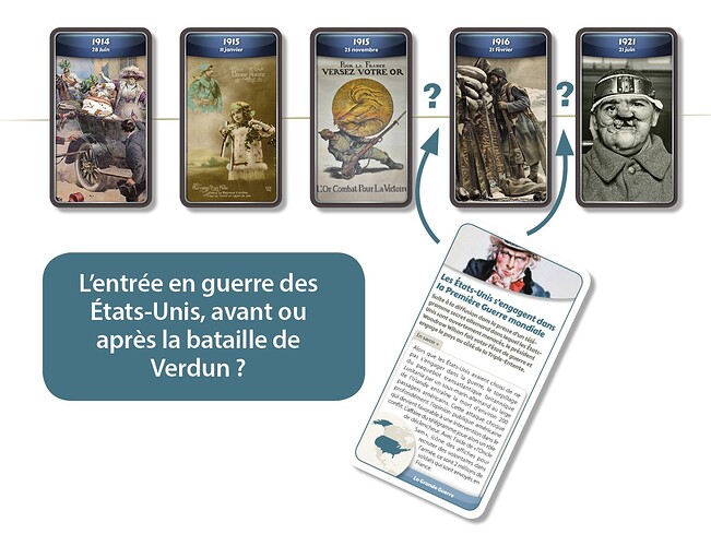 Pour rappel du principe du jeu : chacun son tour, un joueur tente de resituer un événement dans la frise chronologique. Le premier à déposer toutes ses cartes remporte la partie. Mais attention, si on se trompe, on pioche.