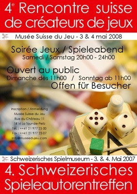 Cette année encore, Vevey, en Suisse, accueille les Rencontres des Créateurs de Jeux au Musée Suisse du jeu. Deux jours de travail et, surtout, de bonne humeur. Faut dire qu'ils savent accueillir les Suisses. La preuve, j'y étais l'année dernière et j'y retourne cette année. Et niveau présence, on peut noter que l'équipe de 4L (le site avec des vidéos dedans) sera là, ainsi que Cyril Demaegd d'Ystari, Matthieu d'Epenoux de Cocktail Games, Bruno Cathala, Serge Laget, Antoine Bauza, Philipp Sprick de Ravensburger, Bernd Brunnhofer de Hans im Glück, Tom Werneck du Spiel des Jahres, Malcolm Braff, Sébastien Pauchon, etc. Et bien sûr des joueurs suisses et des auteurs en devenir.