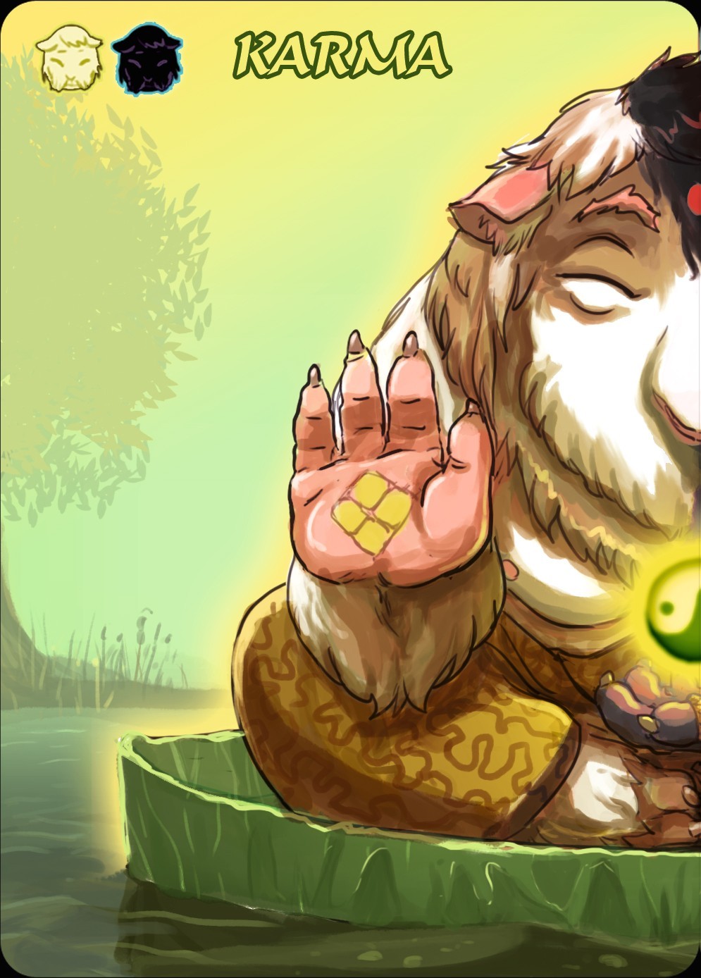 C’est une carte crado, inutile, voire même plus qu’inutile, puisqu’encombrante. Si vous vous posez une question à propos de ce mauvais karma, la réponse est toujours NON! (Exemples : je peux la replacer quand je me réincarne ? NON. Je peux la donner à un petit camarade en arrivant dans sa zone ? NON.) Ne cherchez pas, la seule occasion que vous aurez de vous débarrasser d’une de ces cartes, c’est quand vous rencontrerez cet icône.