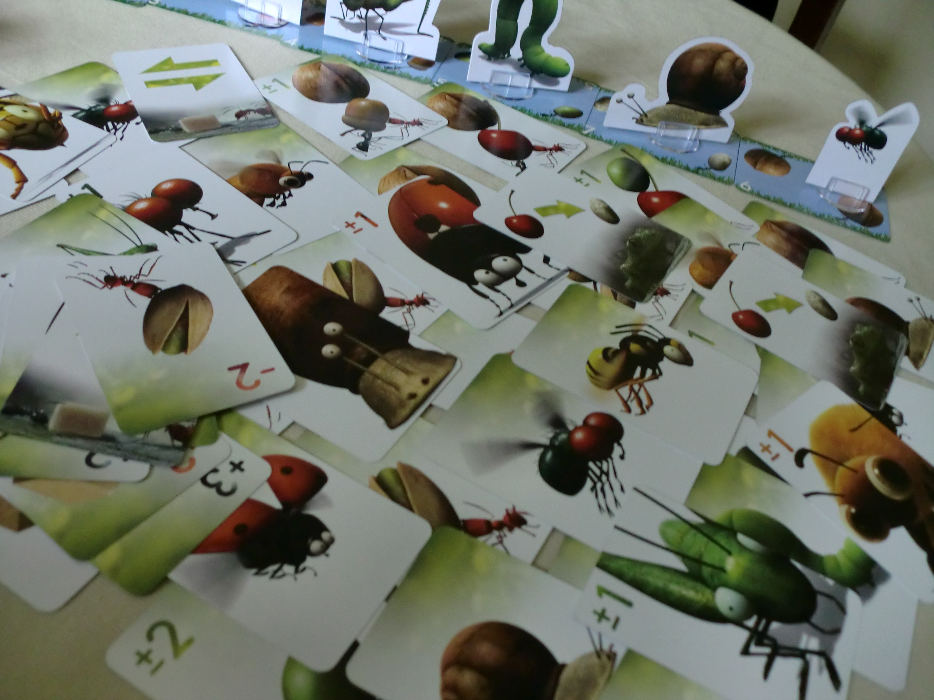Vous pouvez jouer une carte par tour et en appliquer les effets. Soit vous faites avancer ou reculer les insectes qui sont placés sur la ou les cases désignées par la carte d’une, deux ou trois cases, soit vous permutez deux insectes, ou changer d’objectifs selon la carte jouée.