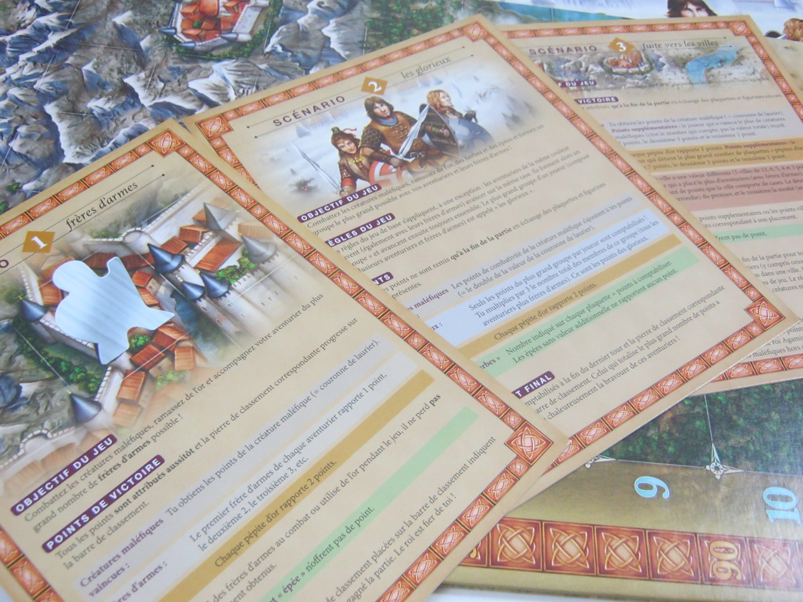 La partie se termine lorsqu’il n’y a plus ni d’épée ni de frère d’armes dans la réserve. Autant vous dire que cela va assez vite. Voici pour les règles de base, chaque scénario apportant quelques modifications en fonction des objectifs.