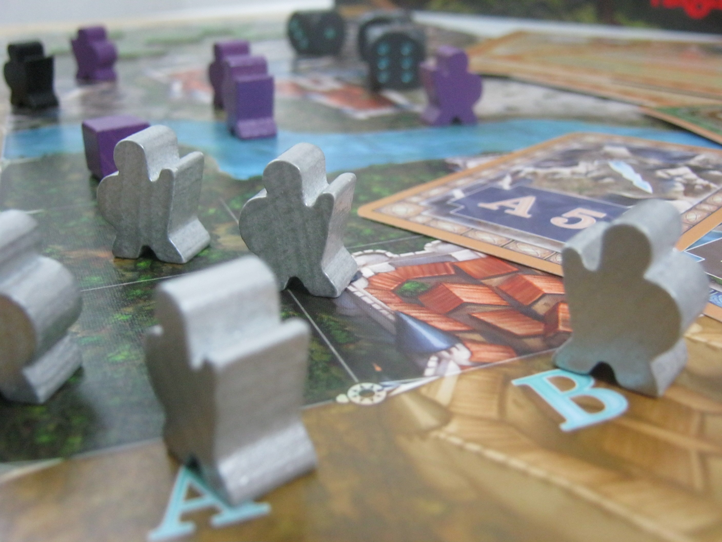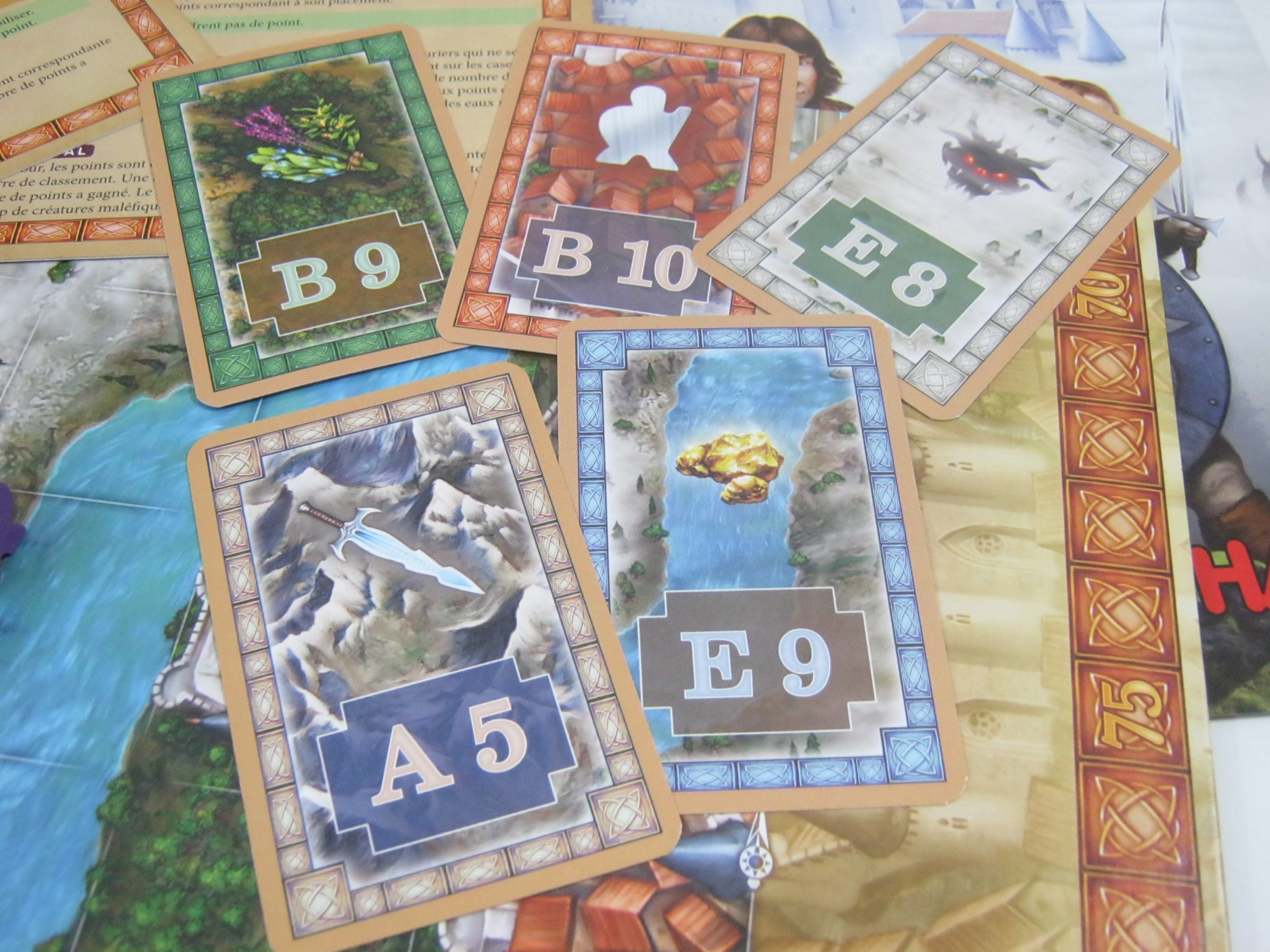 Une fois le plateau déplié vous allez poser dessus 8 tuiles au hasard, en vous basant sur les cartes que vous allez tirer. Un peu à la manière de la bataille navale, le plateau dispose de lettres pour l’axe des abscisses et pour celui des ordonnées des chiffres, permettant ainsi de vous y retrouver. Vos aventuriers quant à eux vont débuter leur périple en haut à gauche du plateau, réparti sur plusieurs colonnes ou lignes. Un tour de jeu consiste à tirer deux cartes, à poser les tuiles correspondantes, le type étant indiqué sur la carte, puis à faire deux déplacements. Mais attention vos aventuriers ne pourront se déplacer que vers le bas et la droite, jamais vers le haut ou vers la gauche. Vous voici prévenu.