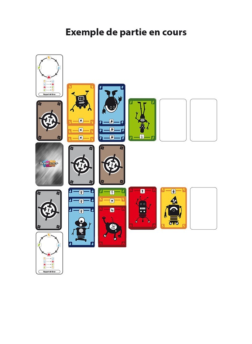 Triocolor est un jeu tactique et rapide pour 2 joueurs dans lequel vous devrez être le premier à poser vos 3 cartes TRIO en formant des combinaisons de 3 cartes de couleur ou de forme identique.
