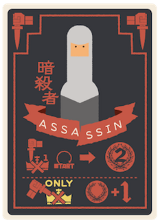 L’assassin : L’assassin tue le noble mais seul l’assassin le plus près du premier joueur pourra bénéficier des points de victoire. Disons qu’il a été le premier à téléphoner pour revendiquer son crime. En plus, il gagne 1 point supplémentaire s’il n’y avait qu’un noble.