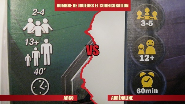 Adrénaline propose de s’y adonner de 3 à 5 joueurs, tandis qu’Argo propose d’y jouer de 2 à 4 joueurs. En somme, vous pourrez y jouer avec le même nombre de joueurs, cependant le fait de pouvoir jouer à 2 à Argo lui octroie un bel avantage, surtout que le jeu sera plaisant dans cette configuration, plus que la configuration à 3 joueurs d’Adrénaline où le plaisir de jeu augmente avec le nombre de joueurs. Donc point de doute sur ce critère, Argo l’emporte.