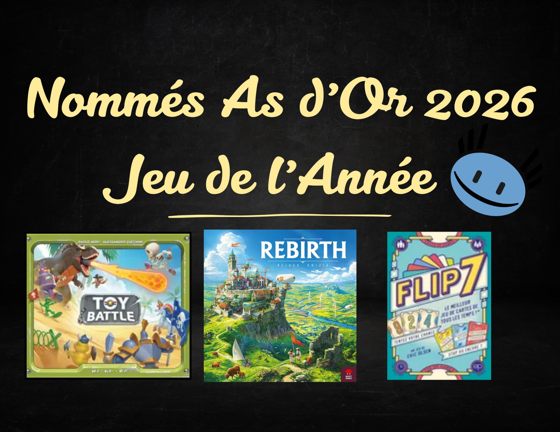 Rebirth, trop joueur pour l’As d’Or (nous ne sommes plus dans les années 1990-2000) et je pense Toy Battle handicapépour le titre du simple fait que ce soit un jeu pour deux.