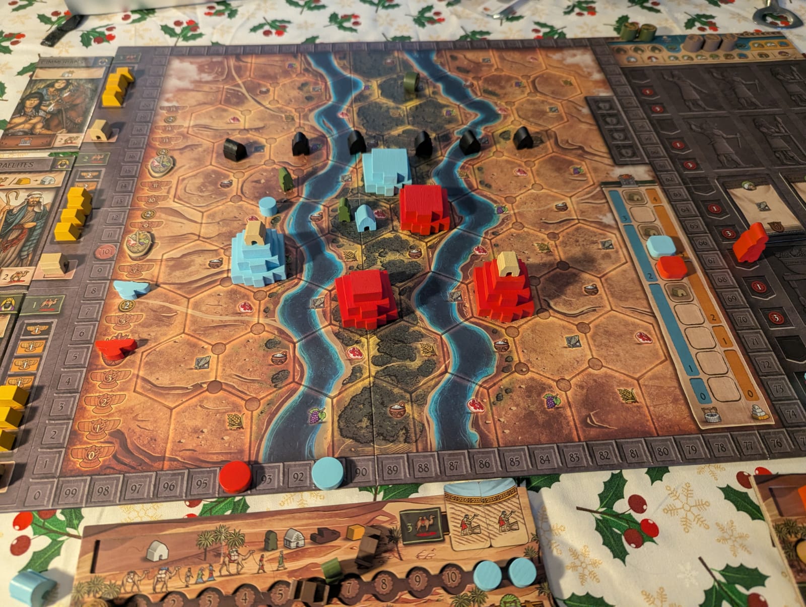 Dès très tôt, un joueur est à la peine, voyant ses options géographiques réduites et le tirage ne pas lui être favorable. Un autre fera deux monopoles sur le dignitaire à 3 influs, marquant ainsi deux fois 16 PV lors des crues, et ne faisant une seconde ziggourat que tardivement. J’arrive à me placer petitement 2e sur chaque décompte de règne.