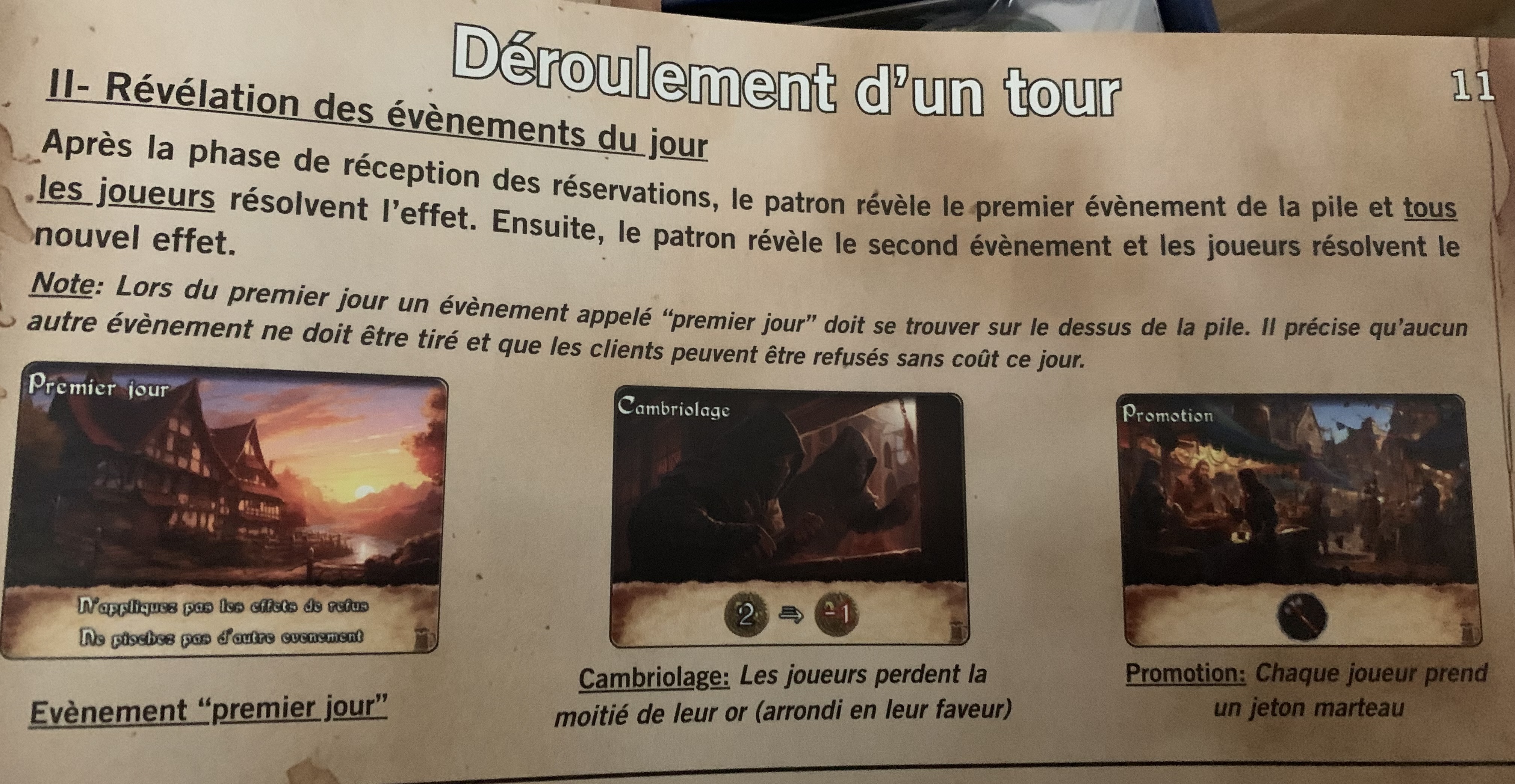 Super merci ! Pour les rĂšgles. Ici. Nous avons compris quâau premier jour nous devions rĂ©soudre seulement cet effet : (premier jour). Concernant les autres jours nous avons appliquĂ©s les effets de « deux cartes » Ă©vĂ©nements. Mais je ne suis pas certaine dâavoir fait les choses correctement. On suppose deux cartes Ă chaque fois pour « Lundi-Mardi », « Mercredi-jeudi » ainsi de suite. Mais comme la rĂšgle spĂ©cifie un seul effet pour le premier jour, nous avons eu un doute !