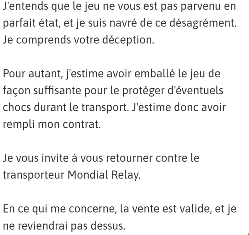 J’aurai préféré tomber sur le même vendeur que toi beliOx … à l’inverse de ton cas mon vendeur était très courtois et communiquant avec de bons avis depuis plusieurs années (pseudo: Wyllgeek), jusqu’à ce qu’il ne réponde plus suite à mon virement de 106 euros (je sais il paraît que ce n’est pas sécurisé mais depuis 2 ans jamais eu de soucis sur ce site, certains vendeurs m’ont même déjà envoyé des jeux et demandé par la suite de leur envoyer le règlement par chèque si tout était ok donc plutôt des expériences basées sur la confiance).