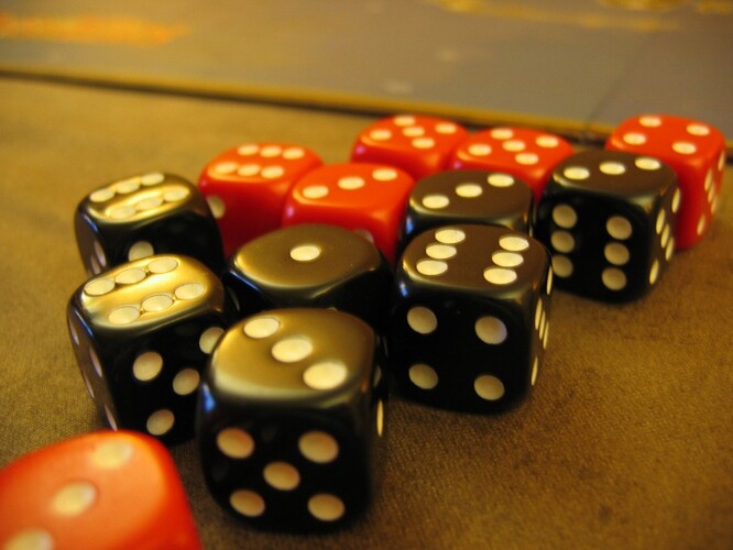 On passe du noir et blanc des dés de la revised au noir et rouge, un peu de couleur, chouette ! On passe aussi de 12 à 14 dés !