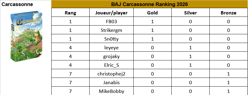 Classement BAJique Carcassonne après 3 tournois: