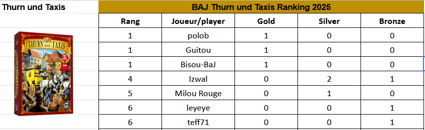 Izwal échoue pour la 2eme fois à gagner cette finale Thurn un Taxis et prend la 2e place pour une 7e médaille d’argent. La 3e place s’est jouée à rien car teff71 et Guitou ont des scores un peu étrange: 1 et -1… Si un des finalistes pouvait commenter la partie on comprendrait un peu mieux ce qui a pu se passer…